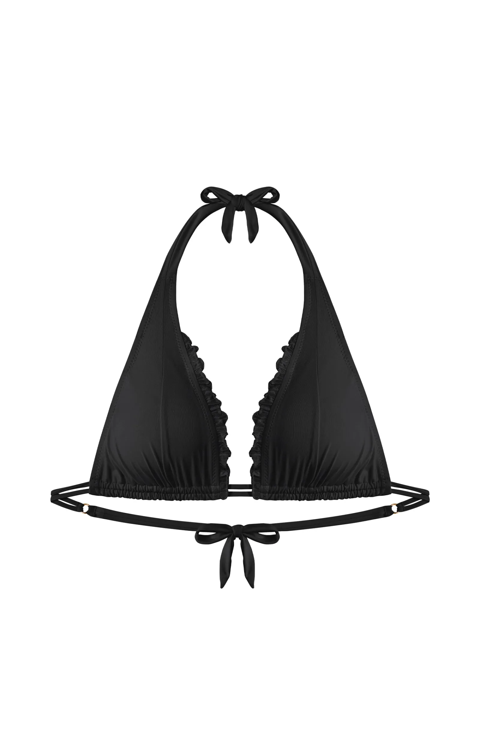 Avec ses coques amovibles, le haut de maillot AMELYS sublime toutes les poitrines et assure un maintien parfait grâce à son double lien coulissant à nouer dans le dos. Pour dynamiser le décolleté en toute légèreté, les triangles se parent entre-seins de petits volants en voile coordonné. Le noir, une couleur intemporelle et toujours élégante.