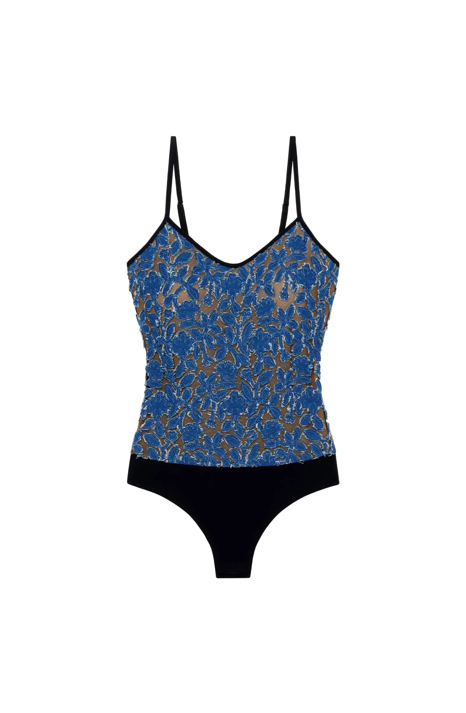 - Body avec broderie en jean sur fine résille noire transparente avec motifs à fleurs