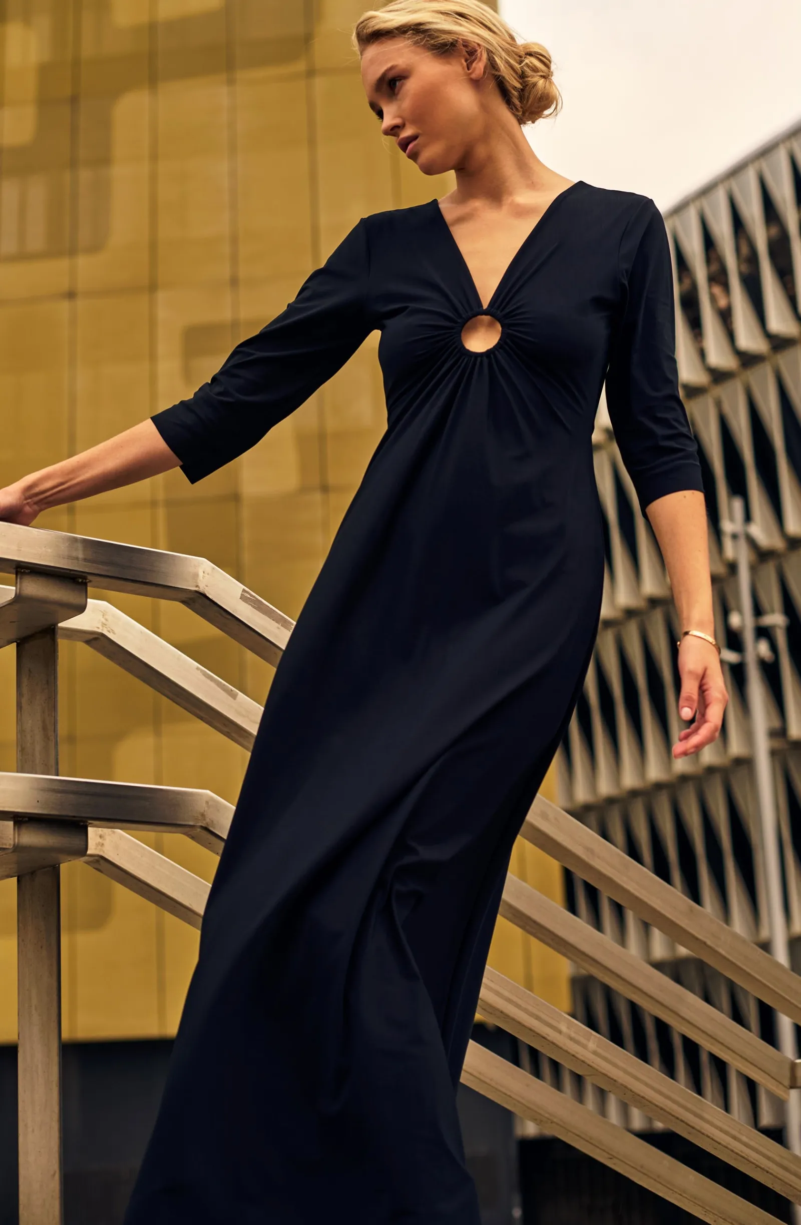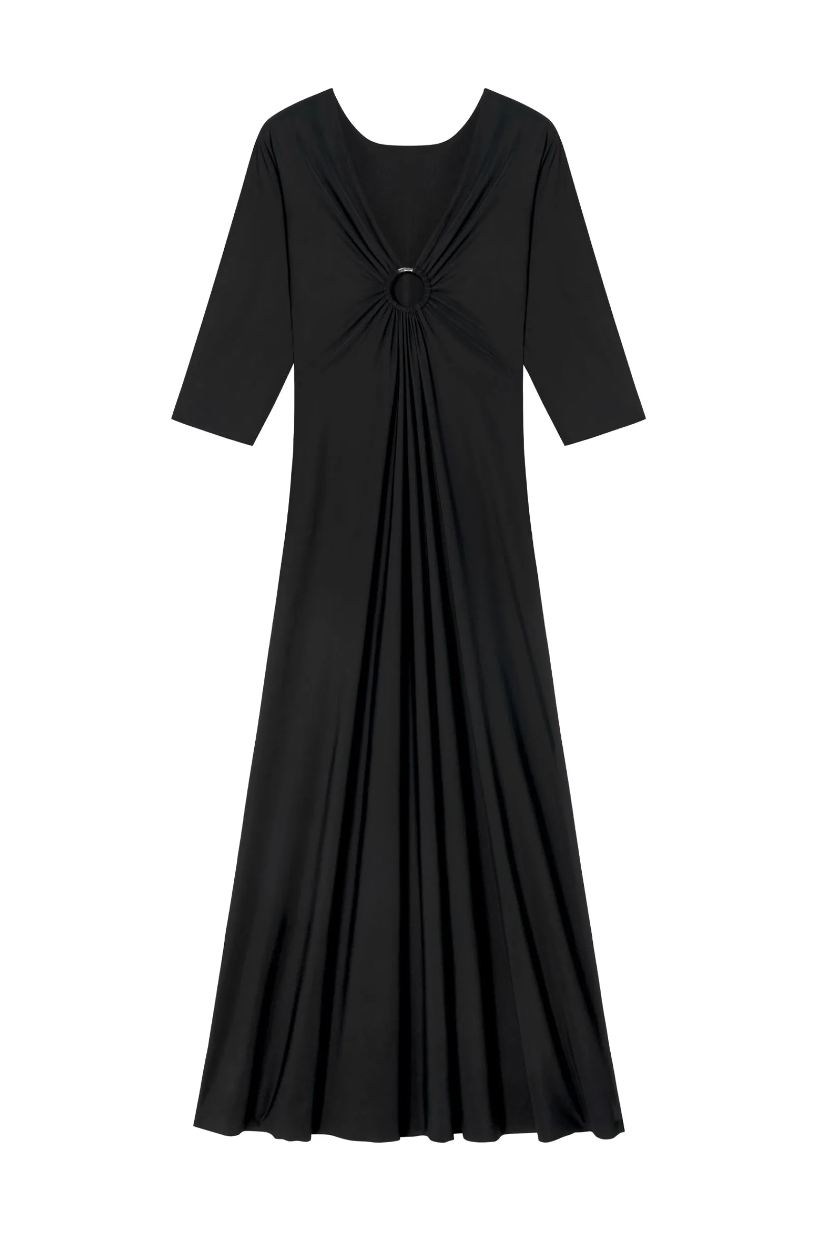 Robe longue manche trois quart avec anneau doré milieu devant