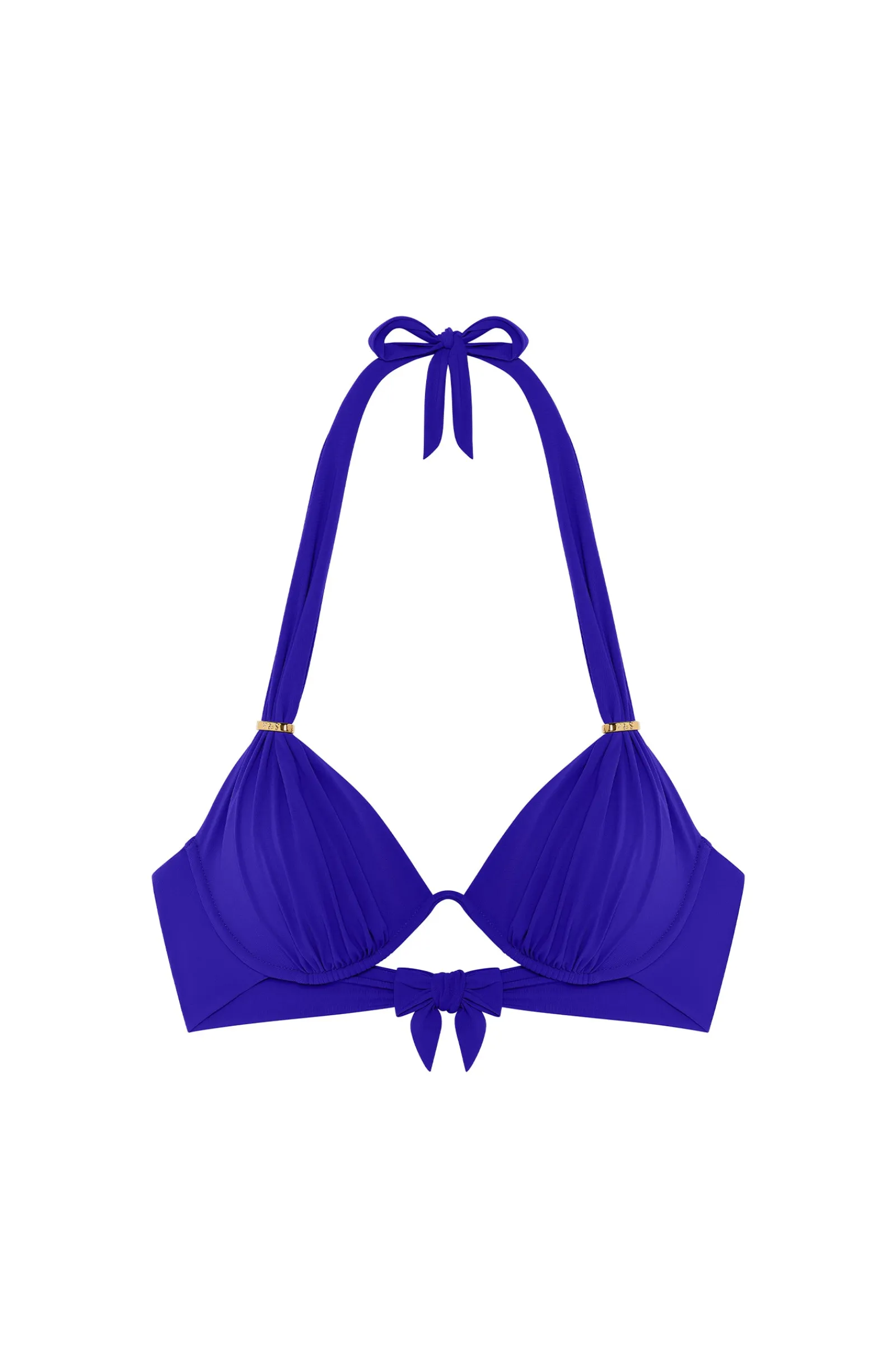 Avec son armature unique, dégagée entre les bonnets, le haut de maillot de bain FABIA est un modèle iconique indémodable. Moderne et raffiné, il se noue dans le dos et derrière la nuque pour s’ajuster parfaitement à la silhouette. Les fronces sous poitrine donnent du relief et les anneaux métalliques le long des bretelles permettent de jouer sur la profondeur du décolleté. Saphir, un bleu envoûtant, profondément lumineux.
