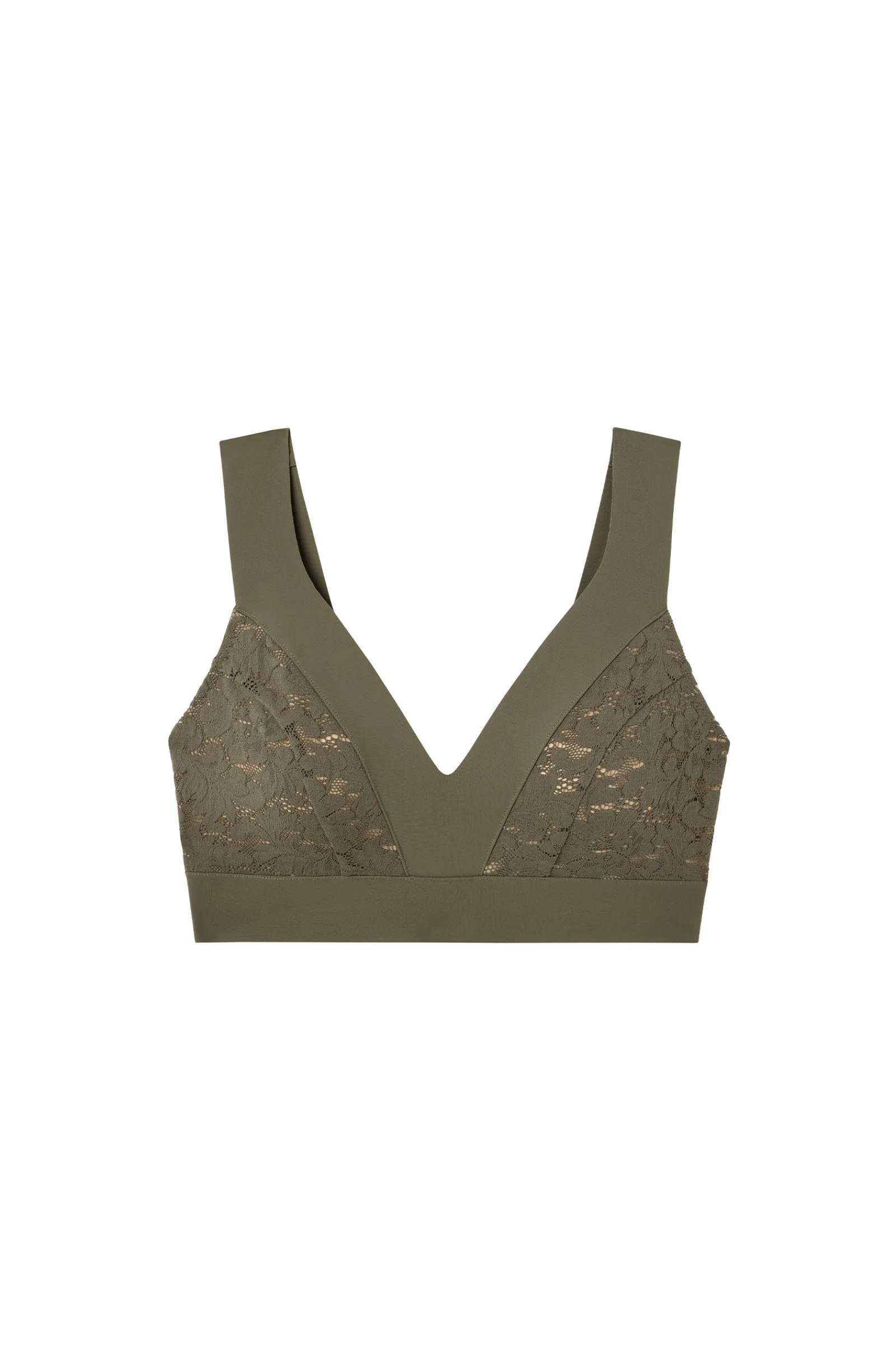 Basique intemporel, la brassière GIU lichen mêle avec style un duo d’exception : la dentelle française et le Bonded. Léger et sculptant, ce soutien-gorge offre une coupe travaillée et confortable. Lichen, une teinte organique, vert kaki.