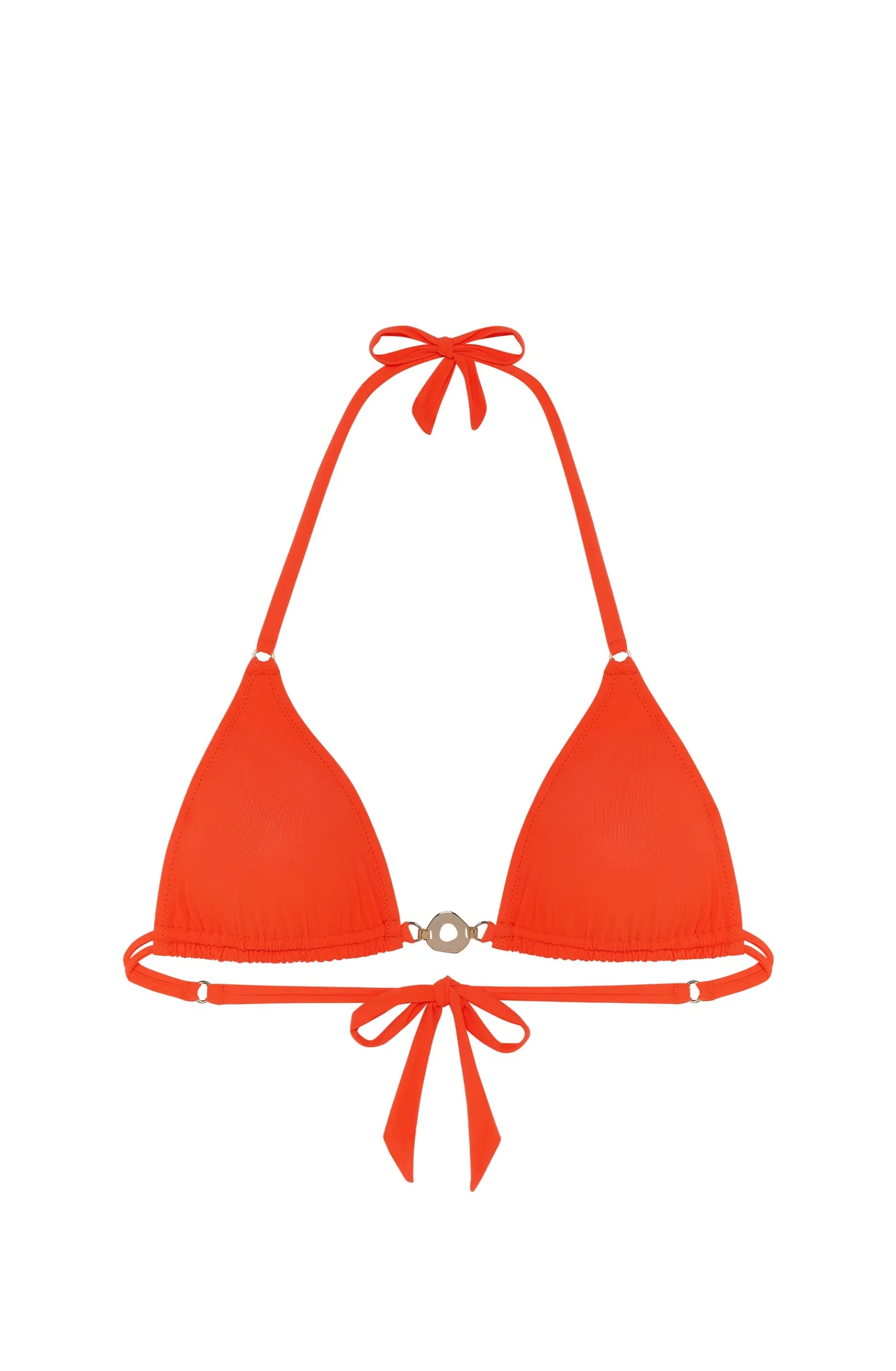 Dans un esprit couture, le haut de maillot triangle IVOA se pare de bijoux dorés. De petits anneaux parent délicatement les bretelles coulissantes. Entre seins, un bijou raffiné souligne avec éclat le décolleté. Un orange moderne, intensément vitaminé.