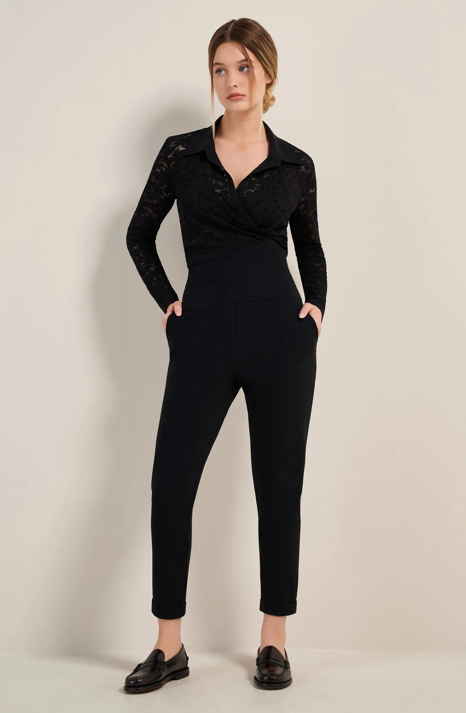 Le pantalon JAZZY revisite, l’intemporelle coupe ajustée du pantalon cigarette. Avec ses petits ourlets en relief et sa large taille élastiquée, ce pantalon tout confort se marie avec toutes les tenues. Le noir, couleur intemporelle et toujours élégante.