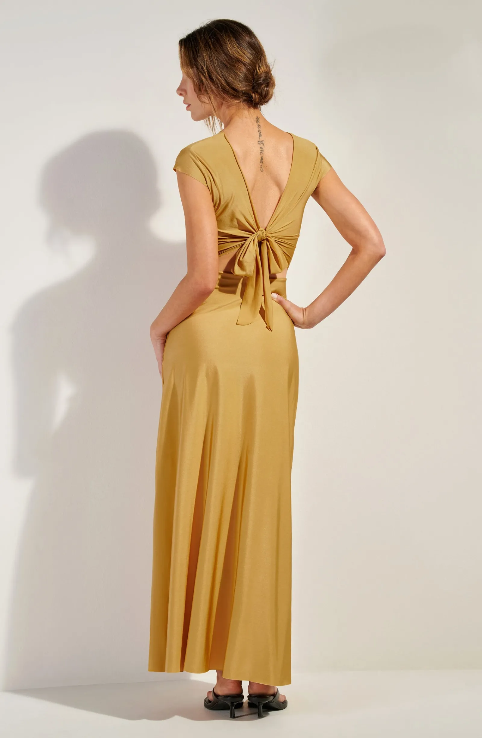 La robe longue et fluide LIL combine crop-top et jupe droite pour une silhouette élancée. Pièce créative dans un esprit couture, elle se porte devant-derrière et se noue de multiples façons pour jouer du décolleté et affirmer sa féminité. Gold, un jaune doré solaire.