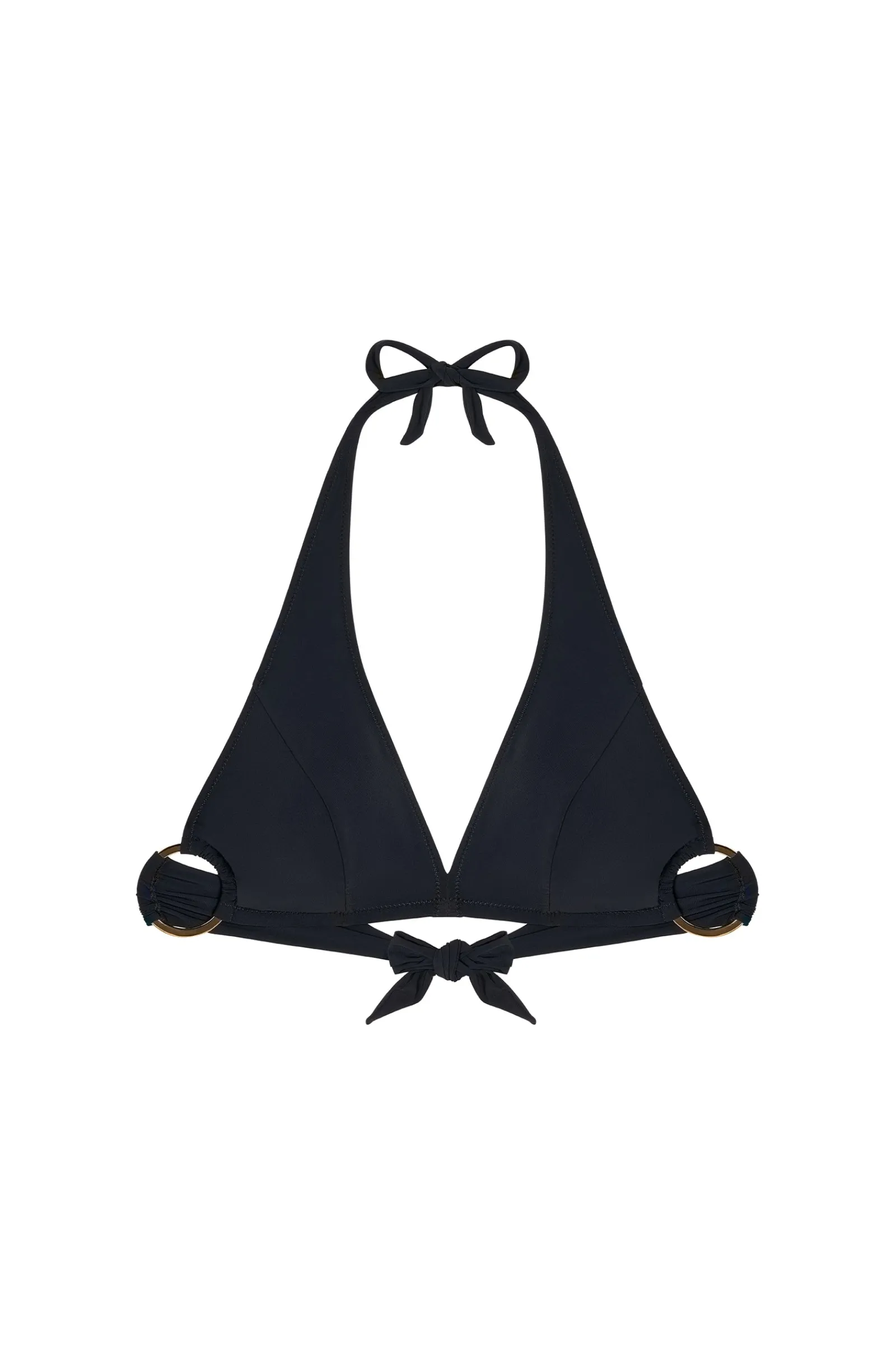 Les côtés du triangle LUCIA se froncent autour d’un grand anneau doré. Une touche raffinée qui sublime avec éclat ce haut de maillot à la coupe classique et intemporelle. Le noir, une couleur toujours élégante.