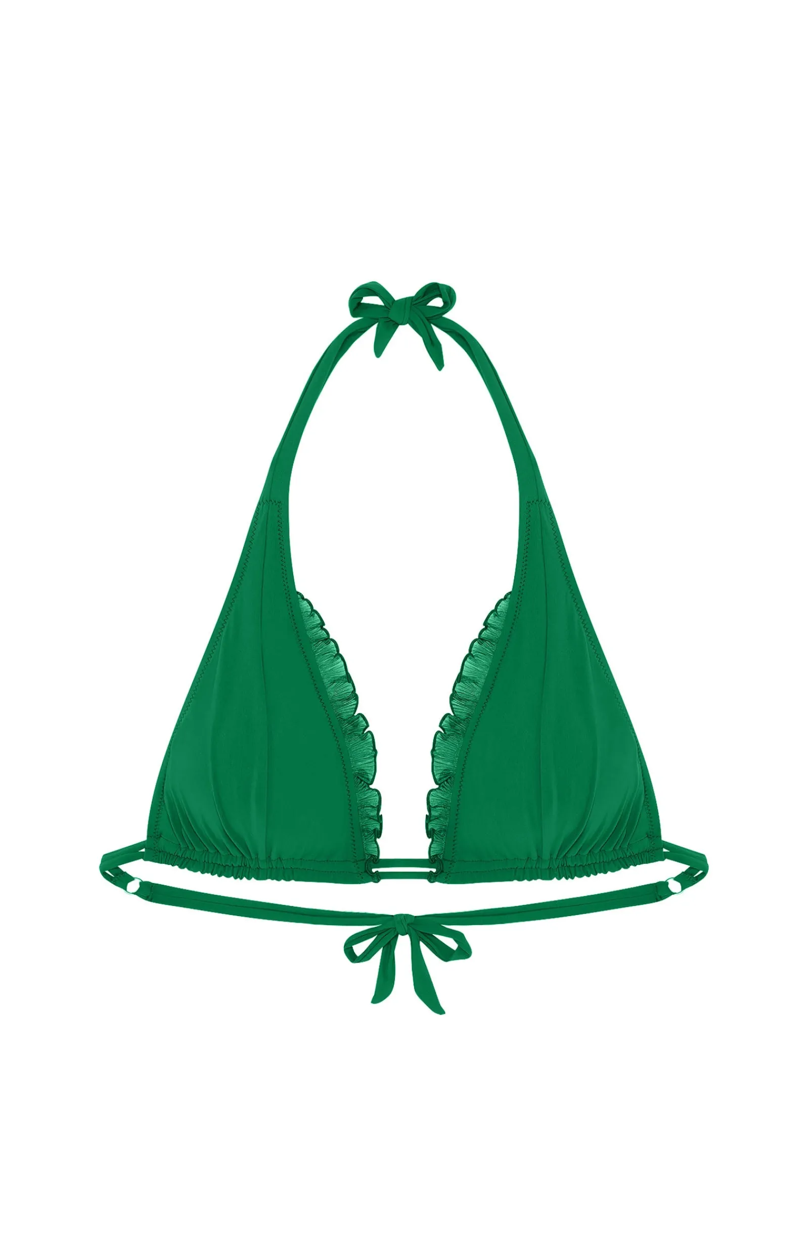 Avec ses coques amovibles, le haut de maillot MAELYS sublime toutes les poitrines et assure un maintien parfait grâce à son double lien coulissant. On tombe sous le charme de ses petits volants en voile plissé qui entourent le décolleté avec légèreté en lui donnant du volume. Les larges bretelles intégrées aux bonnets se nouent dans le dos et la nuque avec élégance. Jade, un vert prononcé intensément doux et lumineux.