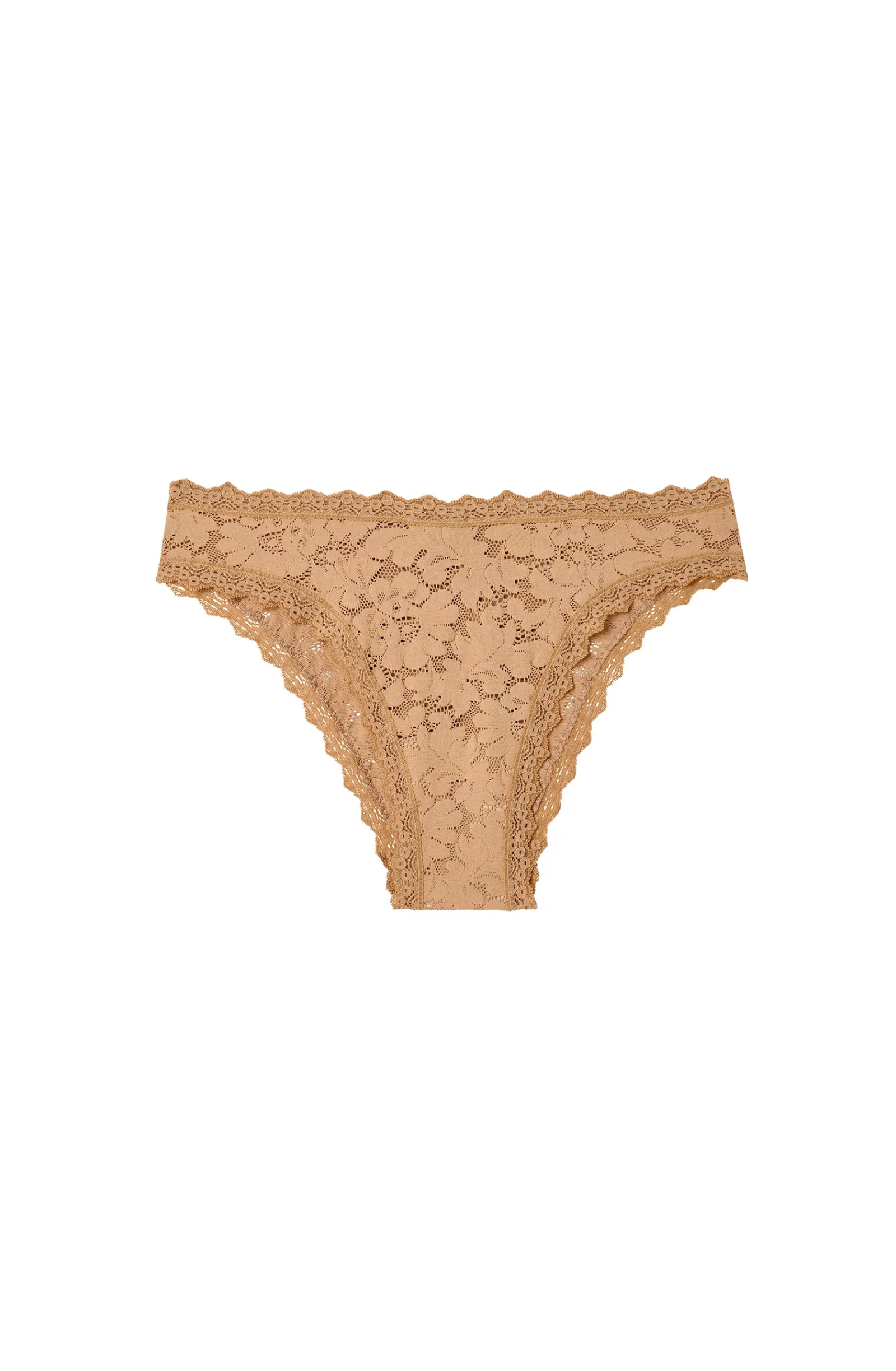 La culotte MAILI en fine dentelle transparente révèle la peau en délicatesse et couvre de douceur et de confort. La coupe échancrée affine la silhouette. Biscuit, un beige neutre et doux qui se fond sous les vêtements.