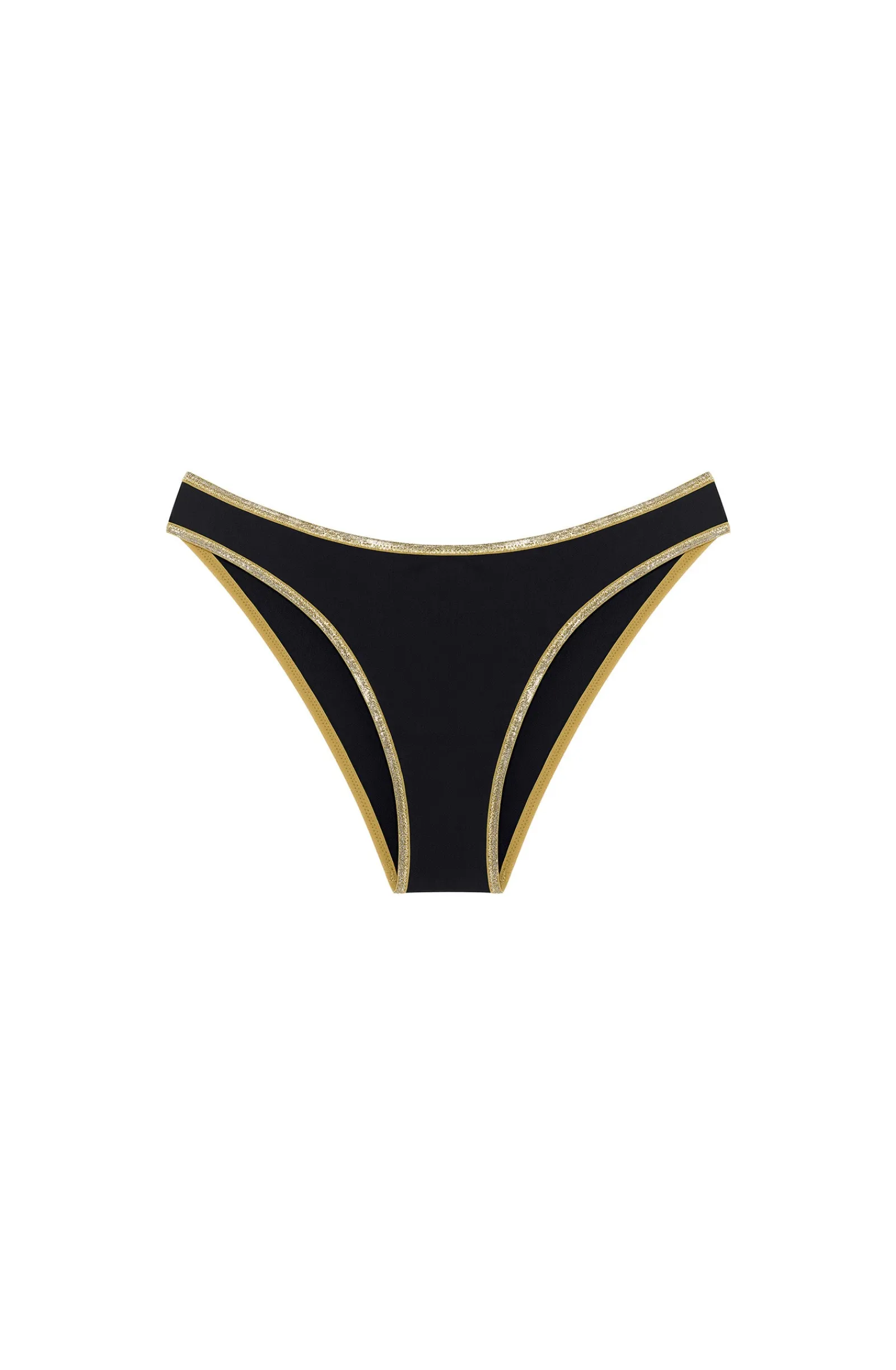 - Finitions taille et tour de cuisses avec un bord plié élastique en lurex doré sur l’endroit, doux sur l’envers