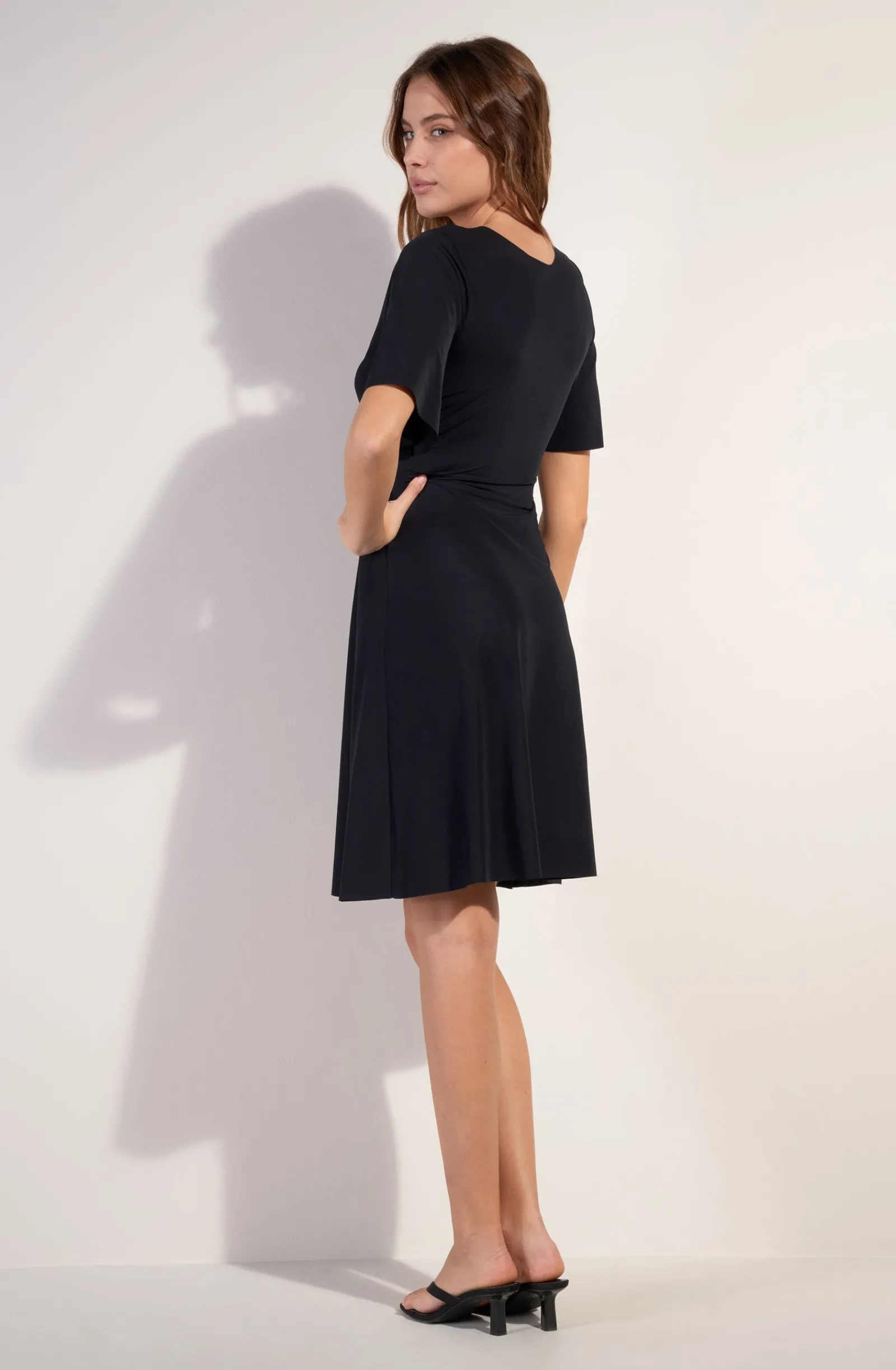 Avec ses petites manches papillon, la robe courte NATT, confectionnée en voile léger, est un joyau de légèreté. Elle se porte recto verso pour jouer des décolletés de son haut à nouer, effet cache-cœur. Le noir, couleur intemporelle, toujours élégante.