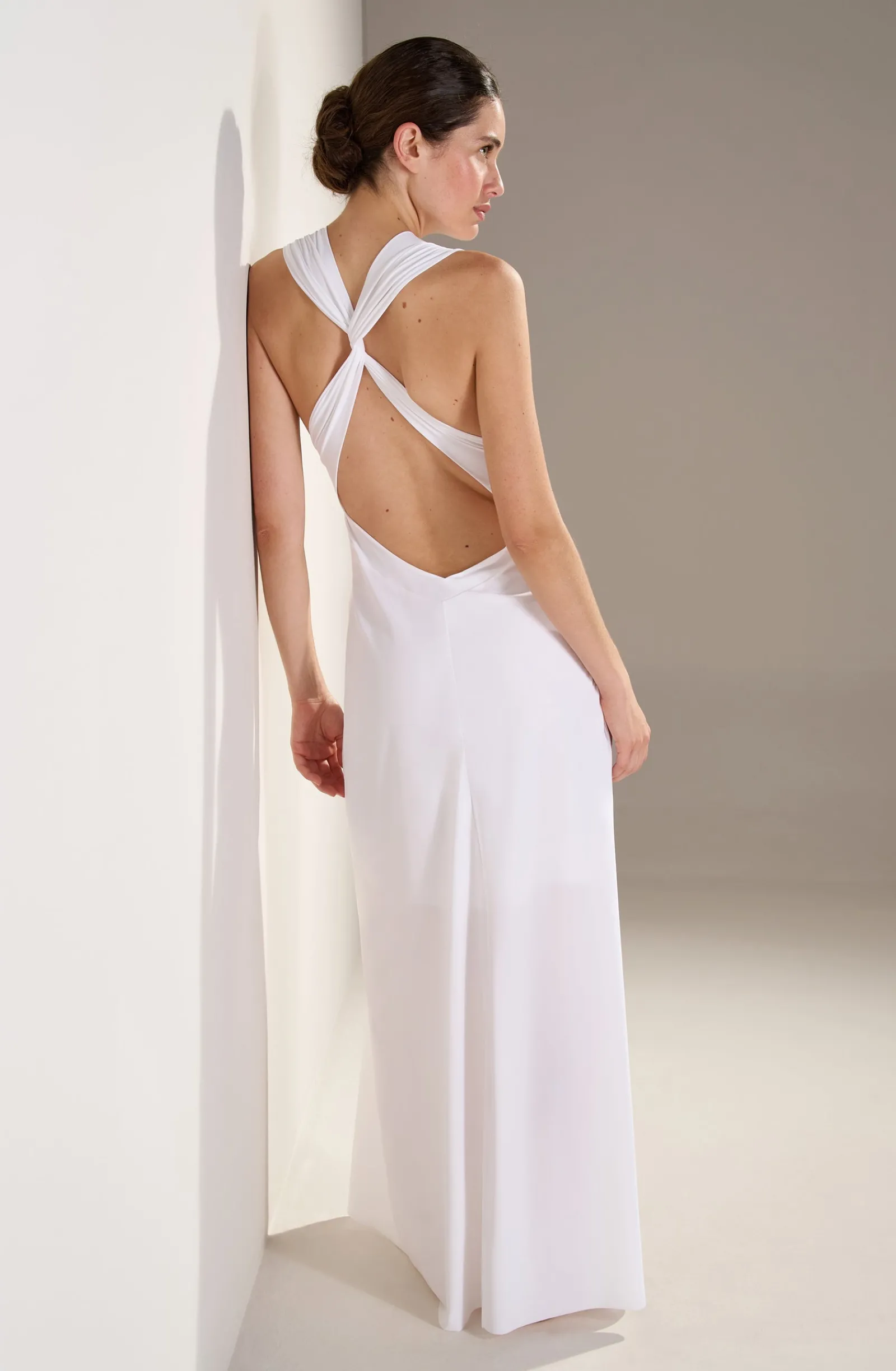 Avec ses lignes pures et dynamiques, la robe longue fluide REENA affine la silhouette et galbe les formes. Devant les larges bonnets froncés mettent en valeur le décolleté. Derrière, les bretelles croisées s’ajustent pour sublimer le dos nu. Pur et délicat, le blanc illumine le teint.