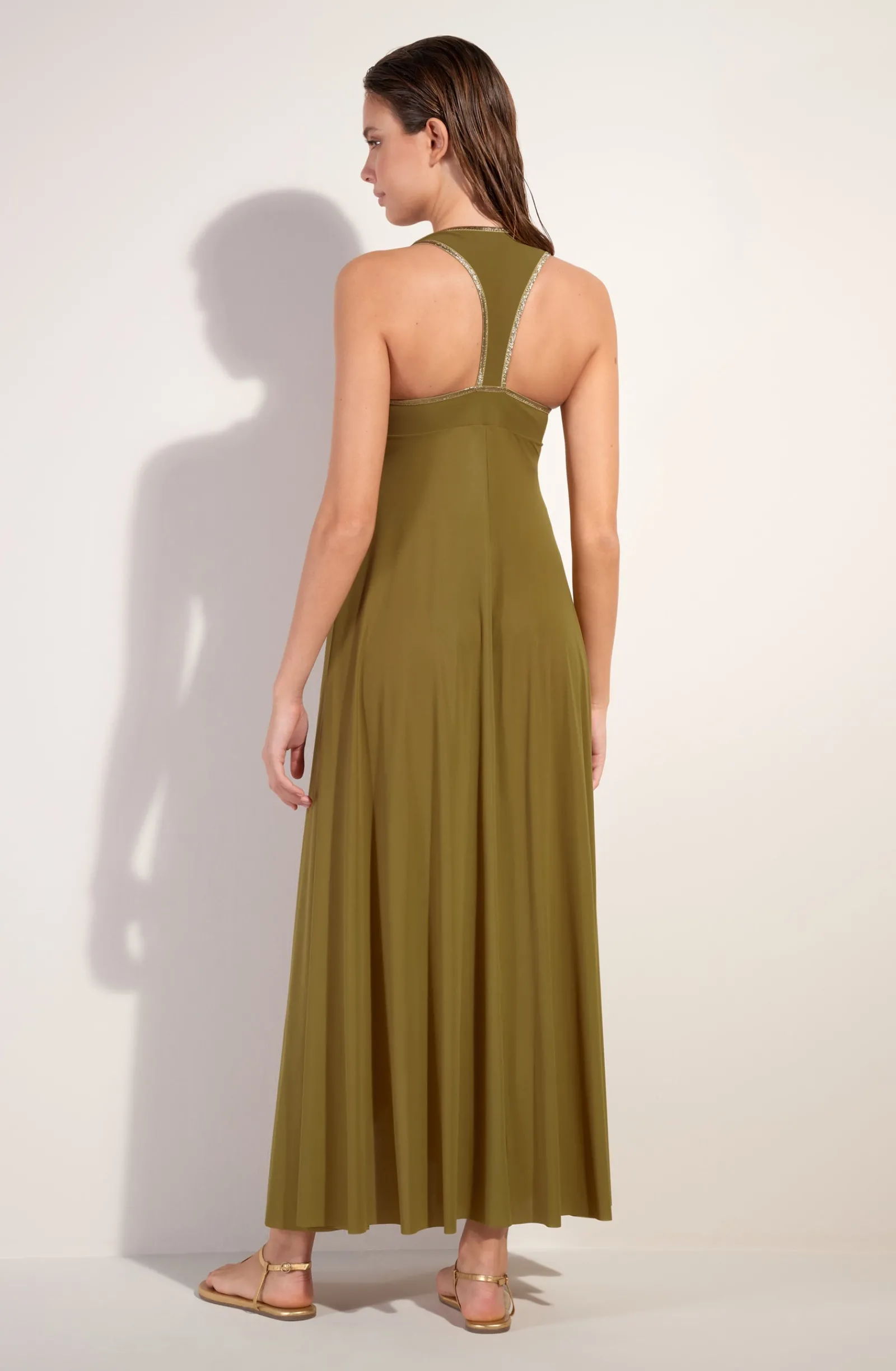 ROSANE joue des volumes avec raffinement. En voile de lycra, cette longue robe ouverte se ferme délicatement entre les seins. L’emmanchure américaine et le pourtour du décolleté se parent de lurex doré pour faire rayonner la silhouette. Bronze, une teinte minérale authentique, combinaison de jaune-vert.