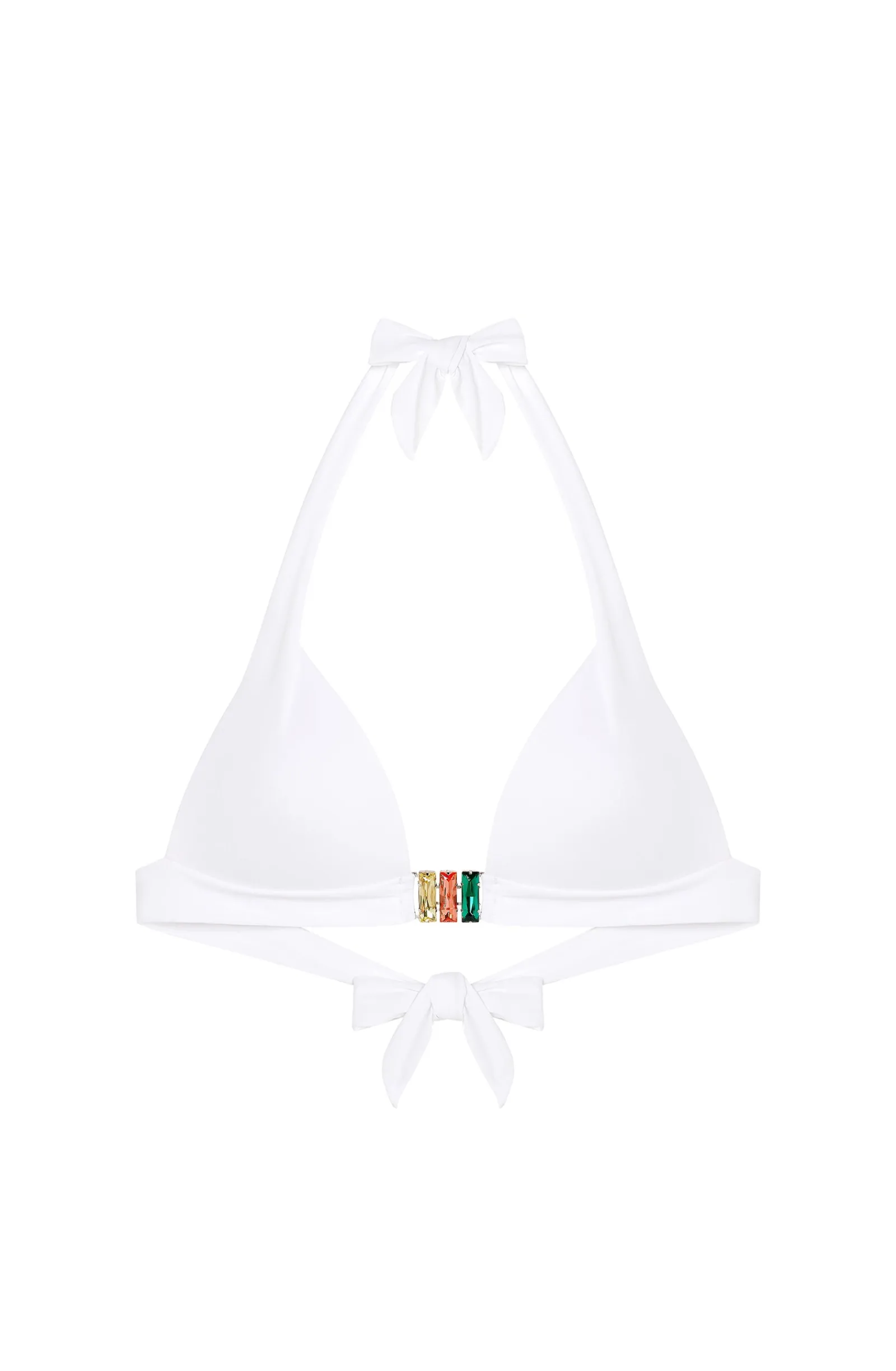 Le haut de maillot SWAIN revisite avec éclat la coupe iconique du triangle DIVA. L’effet push-up sculpte les courbes et la bande sous poitrine s’orne entre-seins de bijoux, trois pierres raffinées qui illuminent le décolleté. Pur et délicat, le blanc illumine le teint.