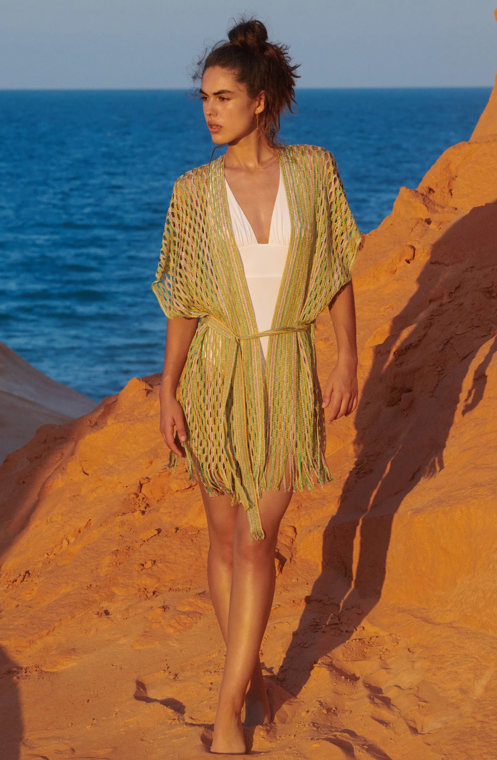 Pièce d’exception, la veste courte VELIA, conçue en large maille filet, dévoile intensément la silhouette. Dans un style bohème assumé, les reflets irisés du lurex doré subliment la peau hâlée. L’imprimé multicolore, un chamarré de coloris vifs et vintage.