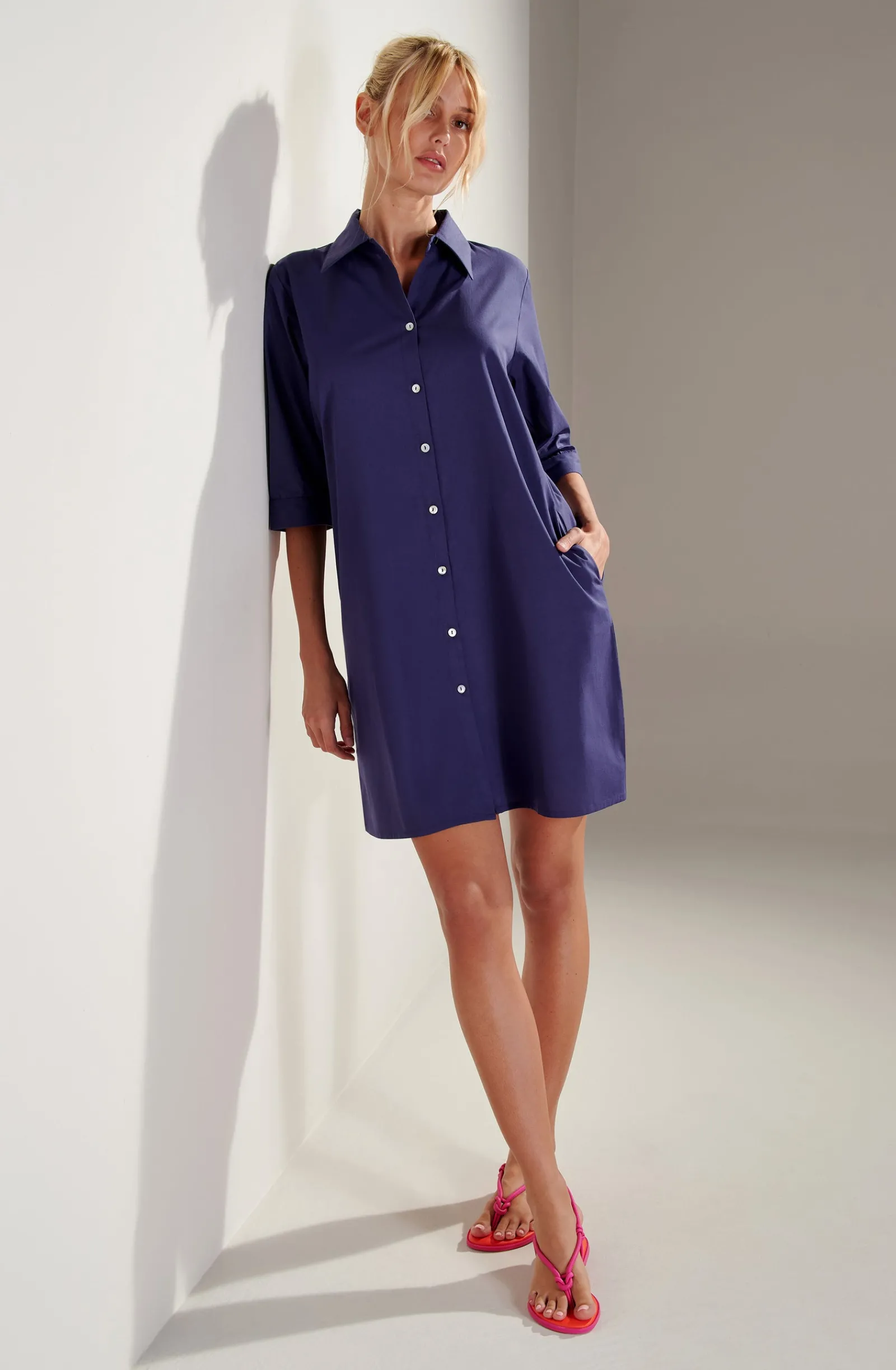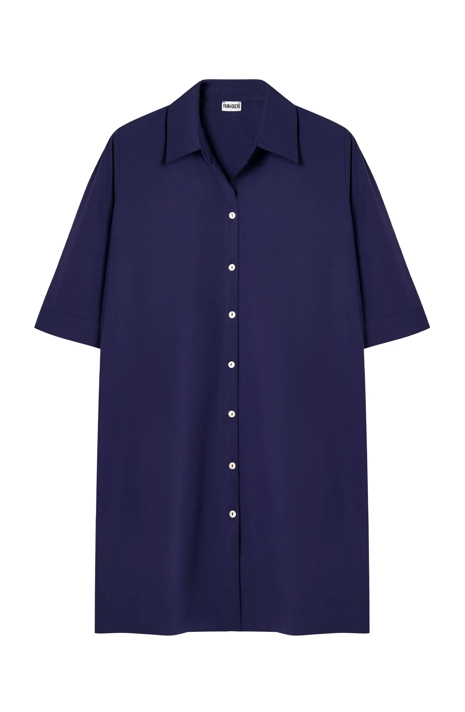 Coupe droite, poches plaquées, manches ¾, la robe chemise AMBRE, confectionnée en voile de coton, est un essentiel. En toute occasion, elle s’invite comme la tenue idéale de l’été. Un bleu marine rappelant les profondeurs de la Méditerranée.