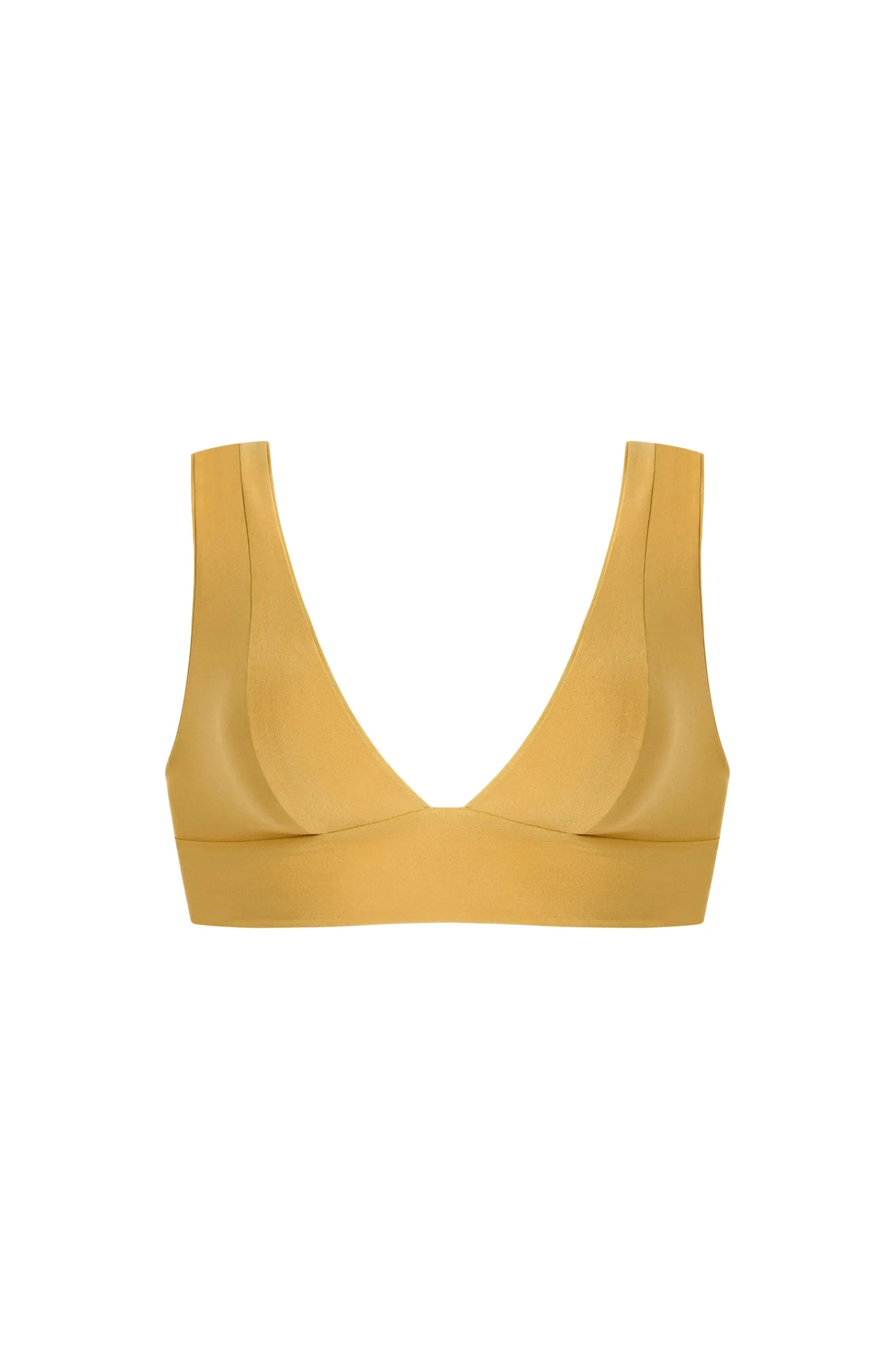 Avec sa large bande sous poitrine à nouer dans le dos et ses bretelles portées droites sur les épaules, le haut de maillot ORAPH a des airs de crop top. La brassière au design simple et sophistiqué révèle un décolleté plongeant. Ce modèle tout confort se décline en toute occasion. Gold, un jaune doré solaire.