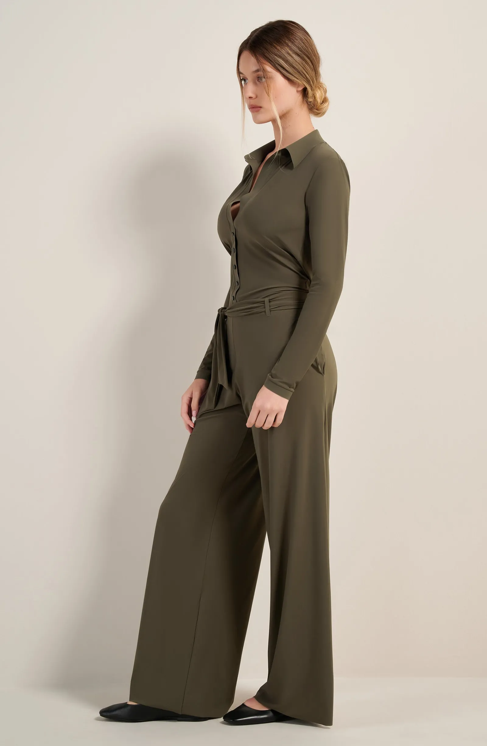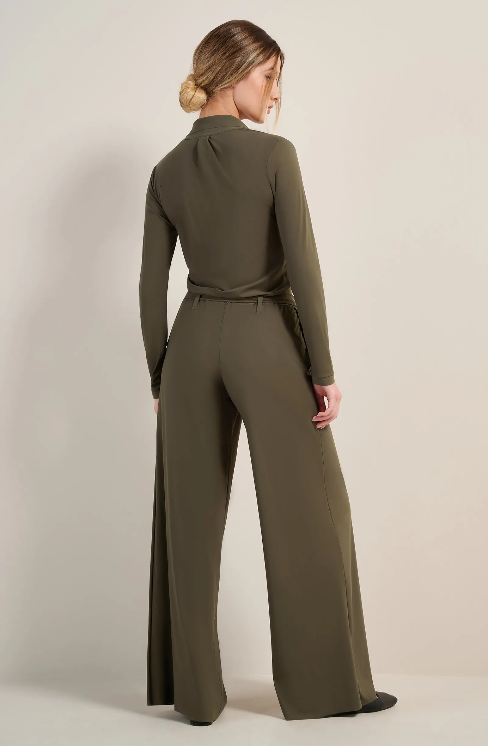 Avec son pantalon fluide et son chemisier délicat, la combinaison COLBI met en valeur la silhouette avec simplicité. Les finitions en Bonded et les boutons-tige amovibles soulignent l’allure raffinée de cette tenue. Lichen, une teinte organique, vert kaki.