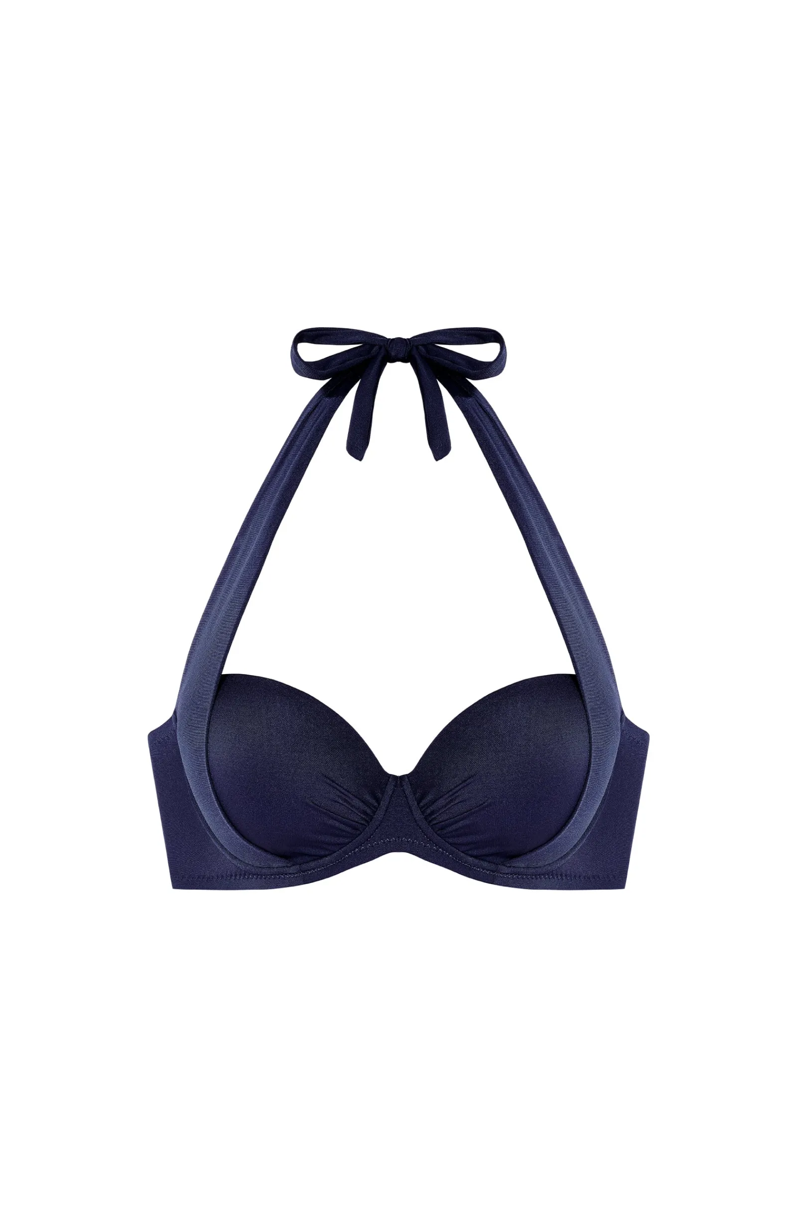 Avec ses bretelles en voile plissé, le haut de maillot multiposition DJANGO se noue selon les envies. Elles s’attachent derrière le cou, se portent droites ou croisées… Ses armatures soutiennent le décolleté tandis que ses coques redessinent la silhouette pour lui donner du galbe. Navy, le bleu des abysses profonds.