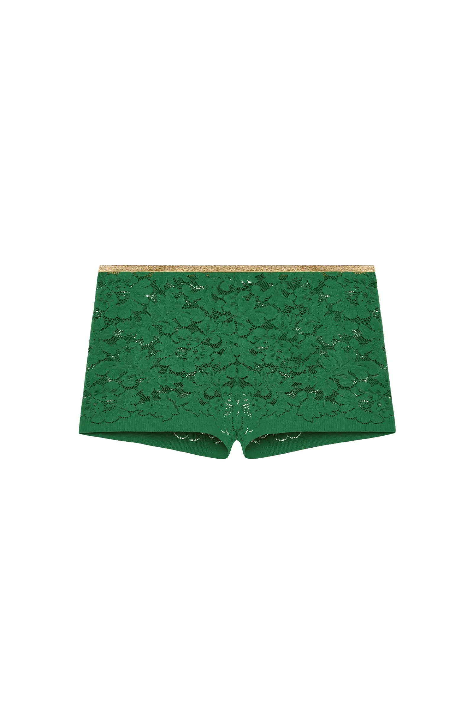 Avec son jeu subtil de matières, le shorty taille haute DYLAN est une pièce iconique de la maison Pain de Sucre. La dentelle française de la culotte se rehausse d’une lumineuse finition en lurex doré pour une allure irréprochable. Jade, un vert prononcé intensément doux et lumineux.