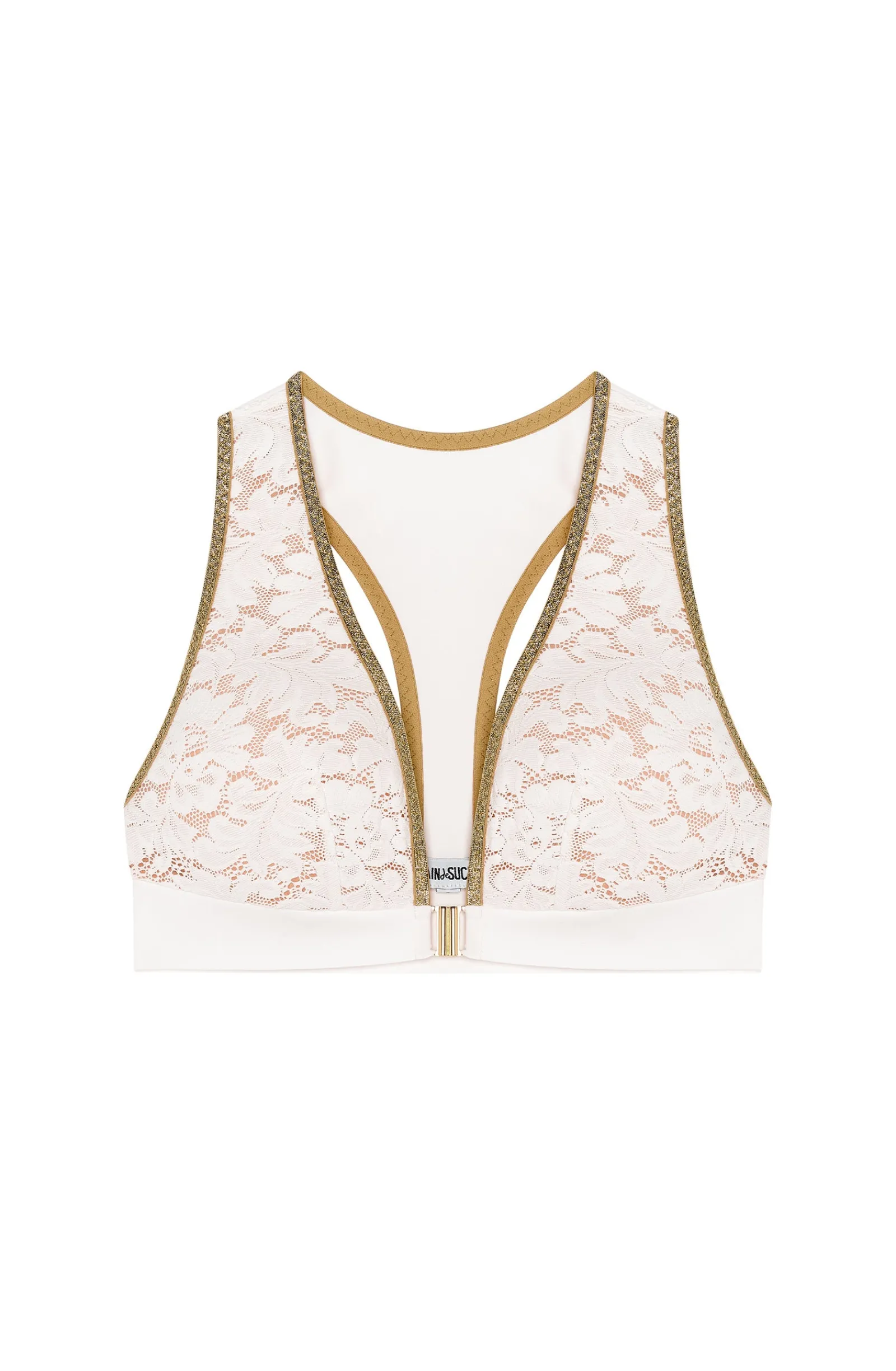 Sans armature, le soutien-gorge GENIA offre un parfait maintien. Avec sa coupe inspirée d’une brassière et sa fermeture dorée sur le devant, ce haut confectionné en dentelle française mixe confort et élégance. Il se pare avec éclat d’une somptueuse finition en lurex doré sur l’encolure. Un blanc au sous ton chaud inspiré de l’écume des vagues.