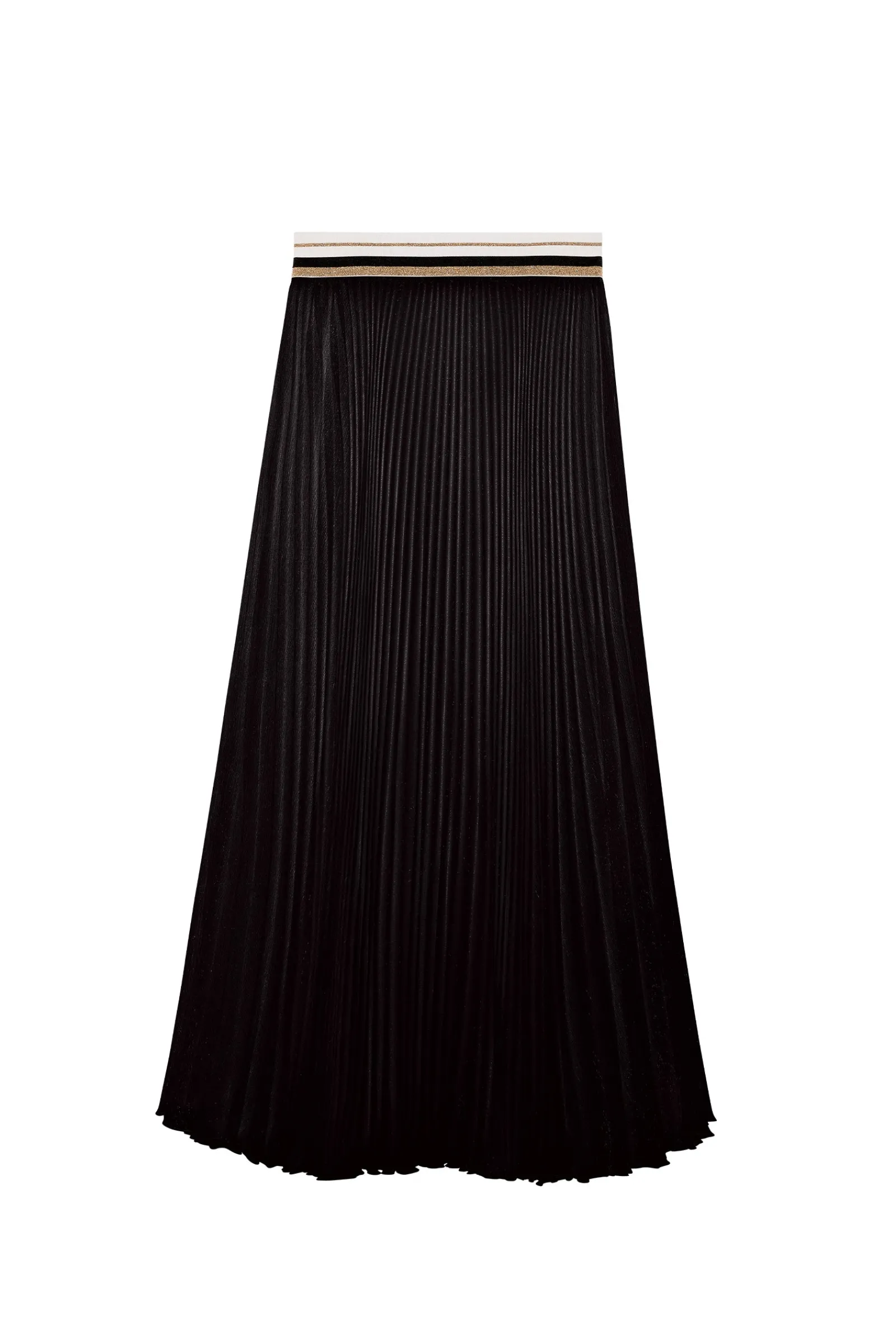 La jupe longue plissée JANKAN est une pièce d’exception. Délicatement irisé, son voile fluide illumine la silhouette. Sa large ceinture élastiquée rayée de noir et de teintes dorées souligne la taille avec contraste. Le noir, couleur intemporelle et toujours élégante.