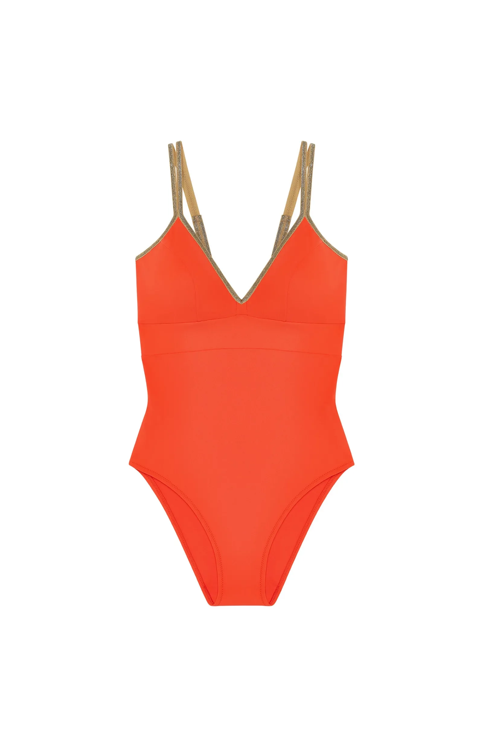 Avec sa large ceinture sous poitrine, le une pièce LAOS offre un excellent maintien. Les pinces de profondeur sous les bonnets dynamisent le décolleté qui est sublimé par une finition en lurex doré. Un maillot à la coupe très graphique qui convient à toutes les morphologies. Un orange moderne, intensément vitaminé.