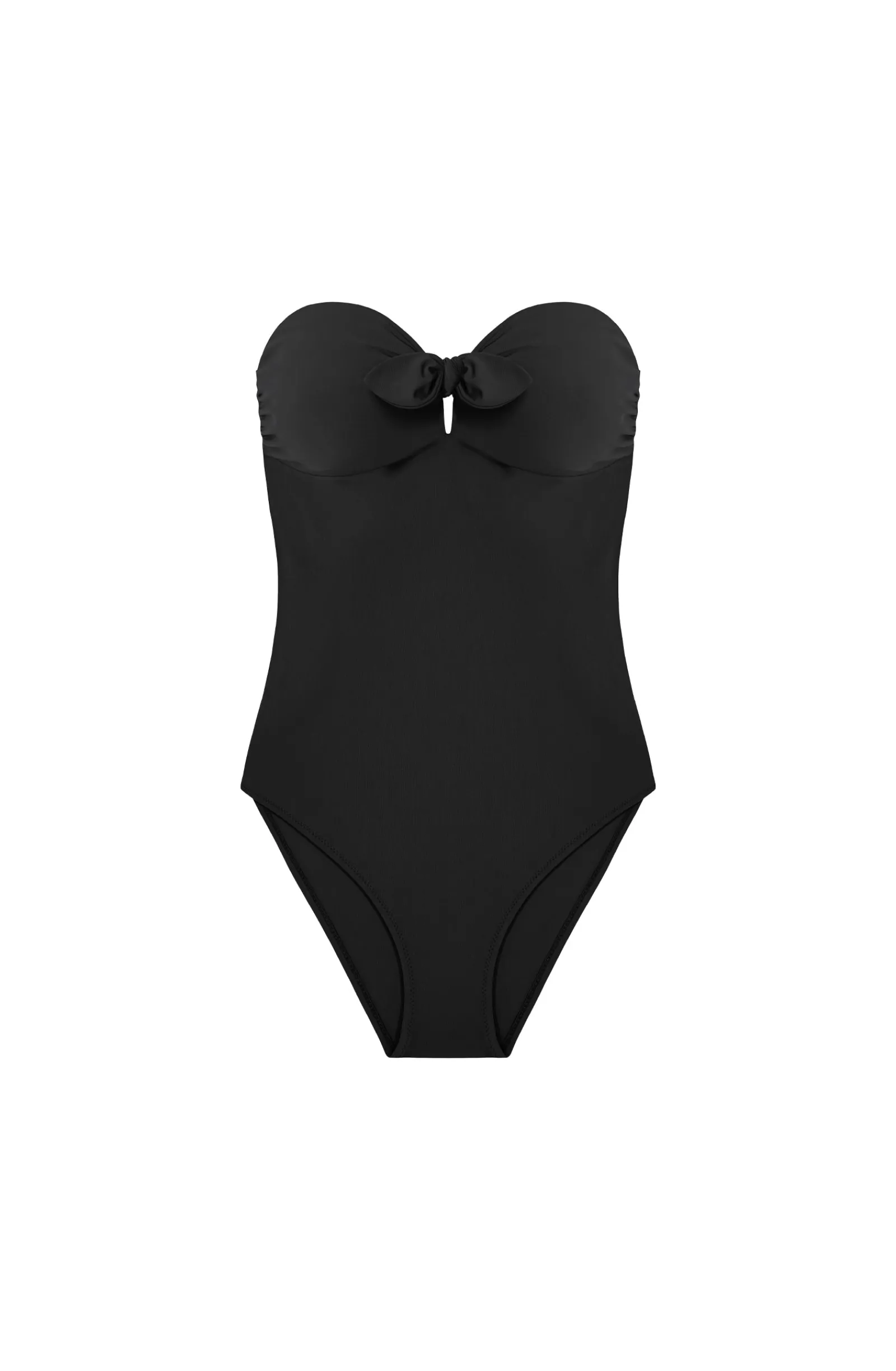 le maillot une-pièce bustier MAO offre une silhouette toute en élégance. Simple et délicatement échancré, il ravit pour son confort et s’ajuste à toutes les morphologies grâce au nœud entre-seins. Le noir, une couleur intemporelle et toujours élégante.