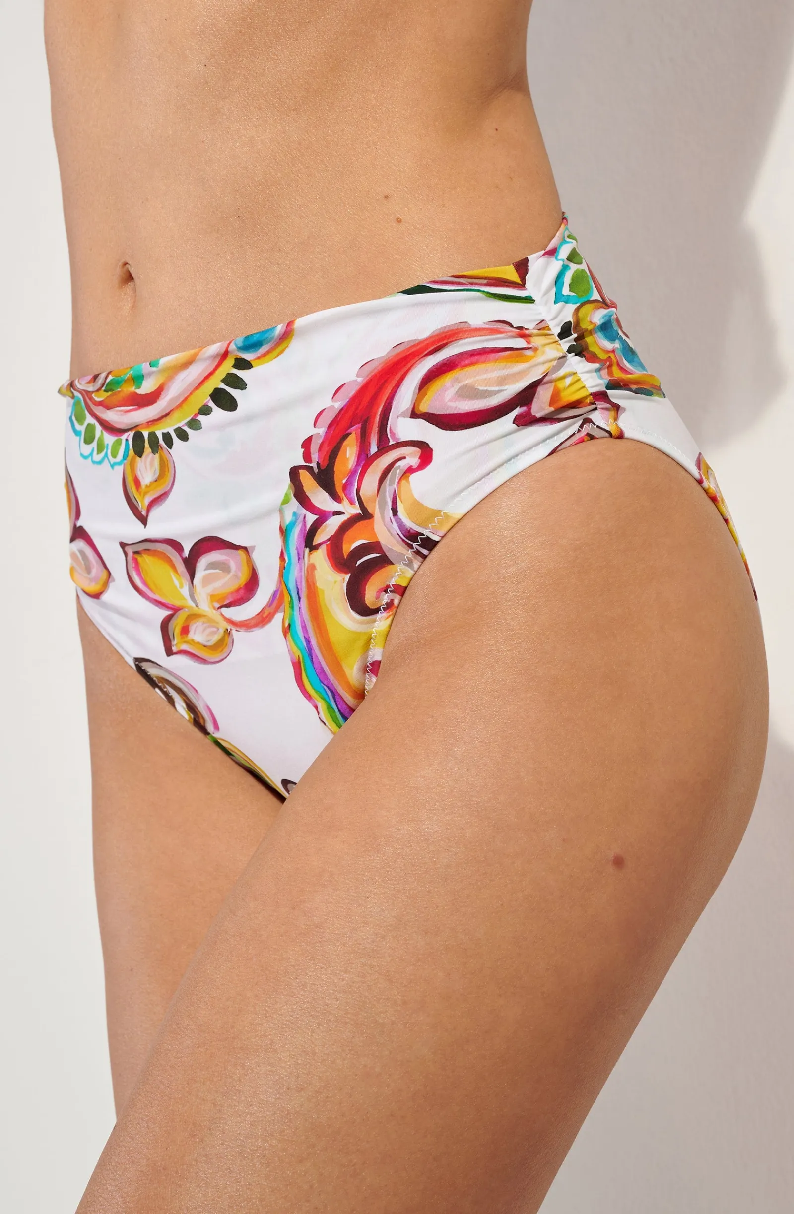 La culotte haute MISHI couvre élégamment la taille. Sur les côtés, le tissu drapé apporte du relief pour sublimer les courbes, tout en gommant subtilement leurs petits défauts. L’imprimé Paisley livre une version allégorique des lettres persanes pour un road trip hippie chic.