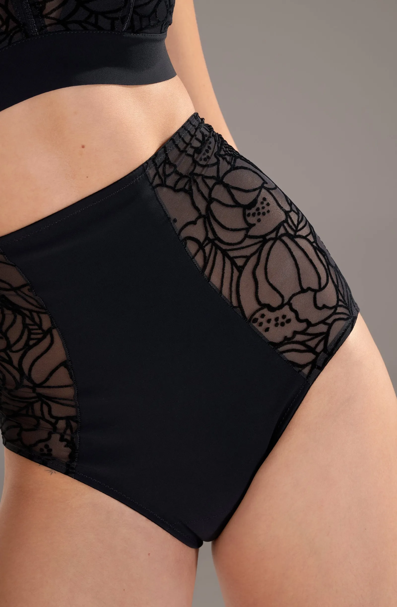 La culotte taille haute Nel, aux accents rétro, combine les matières emblématiques de la maison Pain De Sucre. La dentelle délicatement fleurie s’associe au bonded pour assurer le confort et affiner la silhouette. Le noir, une couleur intemporelle et toujours élégante.