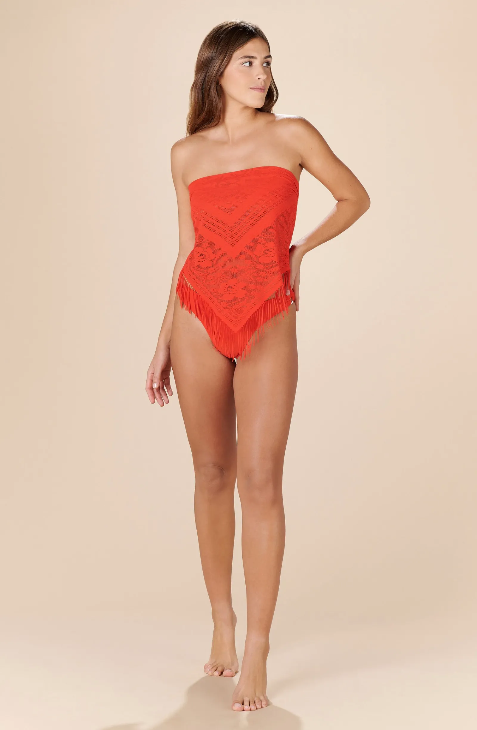 Le paréo en dentelle française PANG est d’une rare délicatesse. Il se noue à la taille pour une allure de sirène ou sur le buste dans un esprit bohème et sauvage. Flamboyant, l’orange iconique rappelle le style pop des seventies.