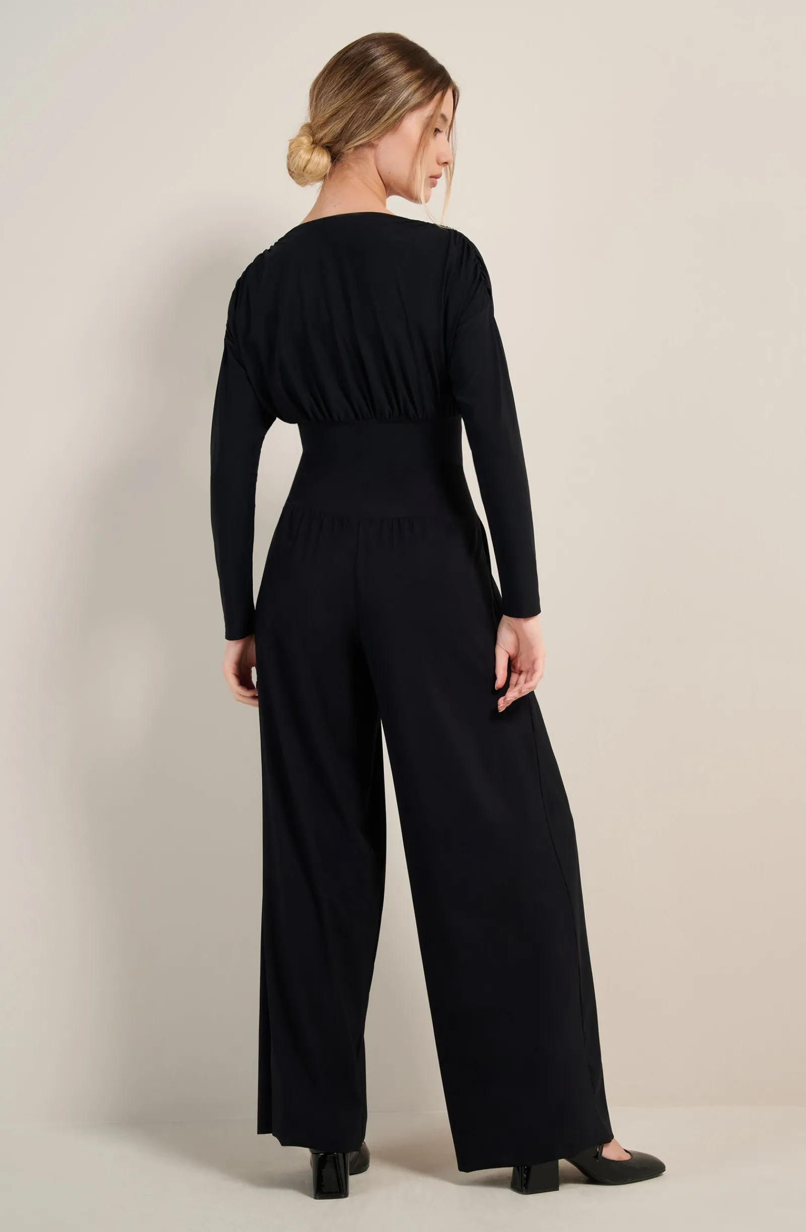 Le pantalon ample PANNA équilibre la silhouette avec style et confort. La large ceinture extensible épouse la taille sans la contraindre et la maille souple structuré de pinces assure un tombé fluide. Le noir, couleur intemporelle et toujours élégante.