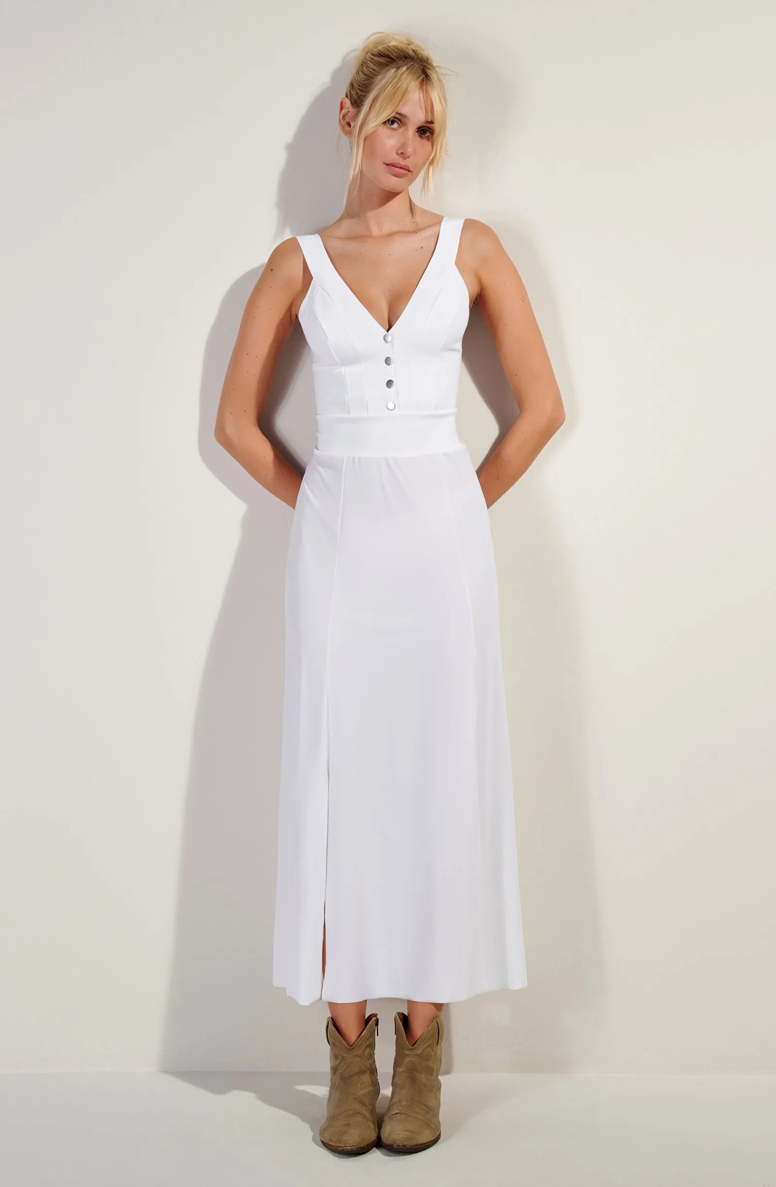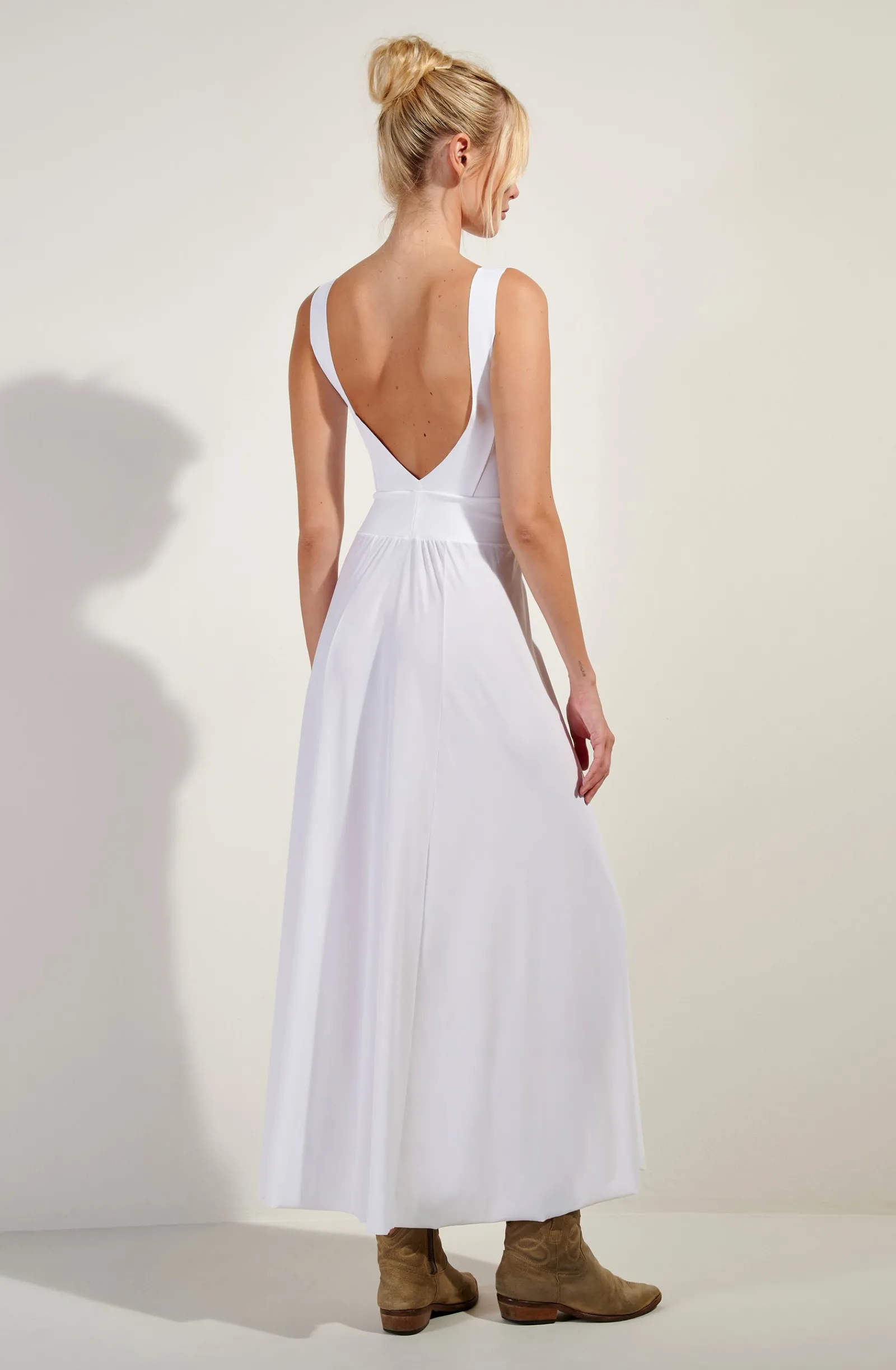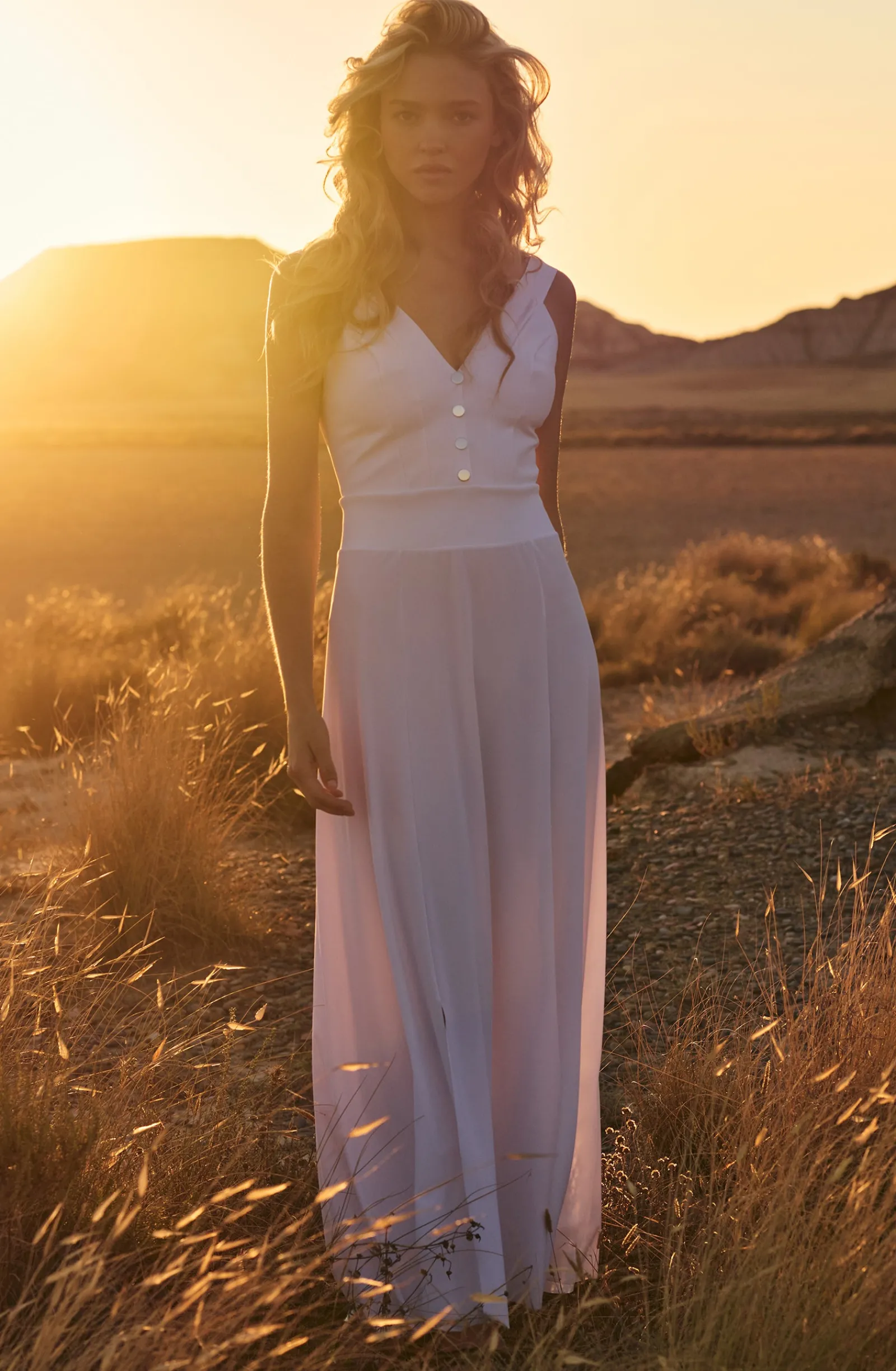 Le haut de la robe longue RALIA s’inspire des iconiques maillots de bain nageur de la maison Pain de Sucre. Profondément décolletée, cette robe se pare de boutons de manchettes réversibles. Détail sophistiqué qui sublime les formes avec fantaisie et souligne la féminité. Pur et délicat, le blanc illumine le teint.