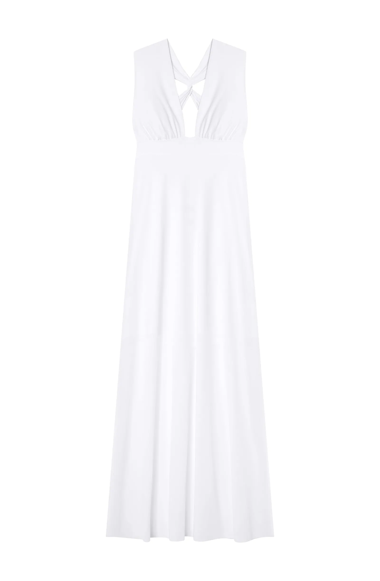 Avec ses lignes pures et dynamiques, la robe longue fluide REENA affine la silhouette et galbe les formes. Devant les larges bonnets froncés mettent en valeur le décolleté. Derrière, les bretelles croisées s’ajustent pour sublimer le dos nu. Pur et délicat, le blanc illumine le teint.