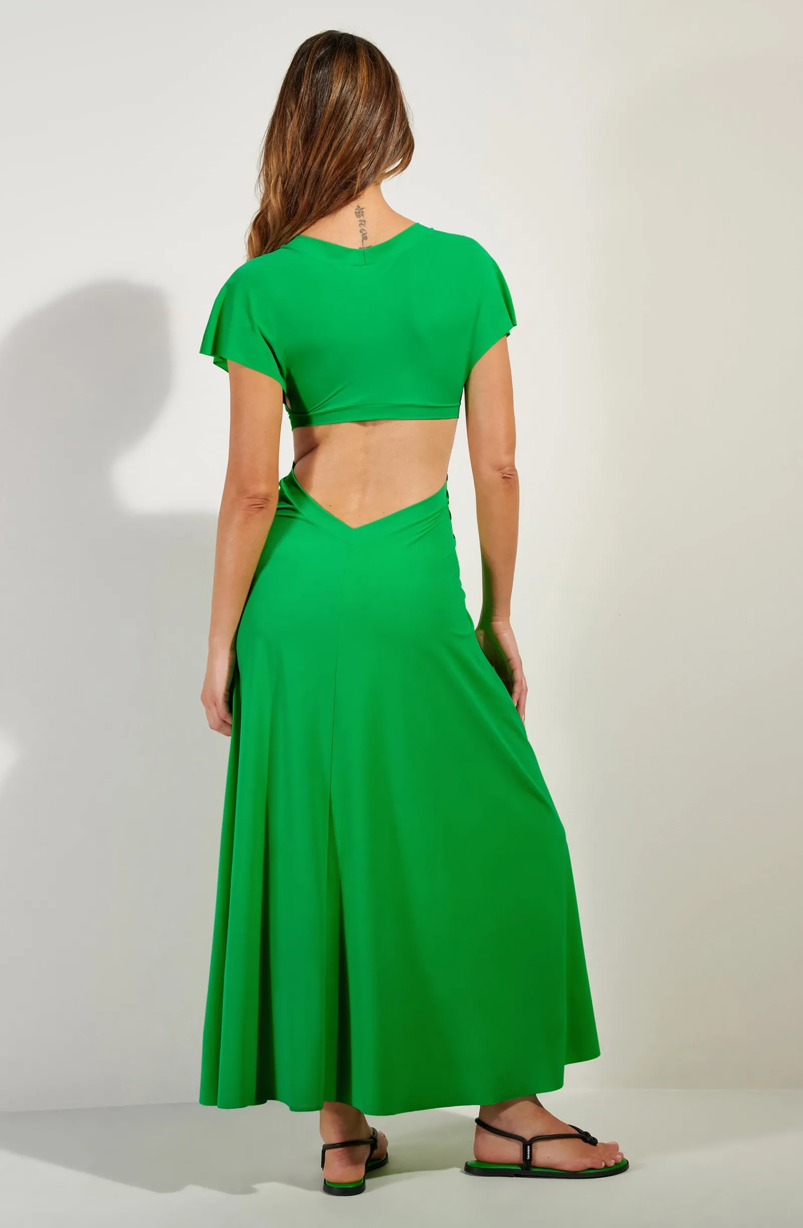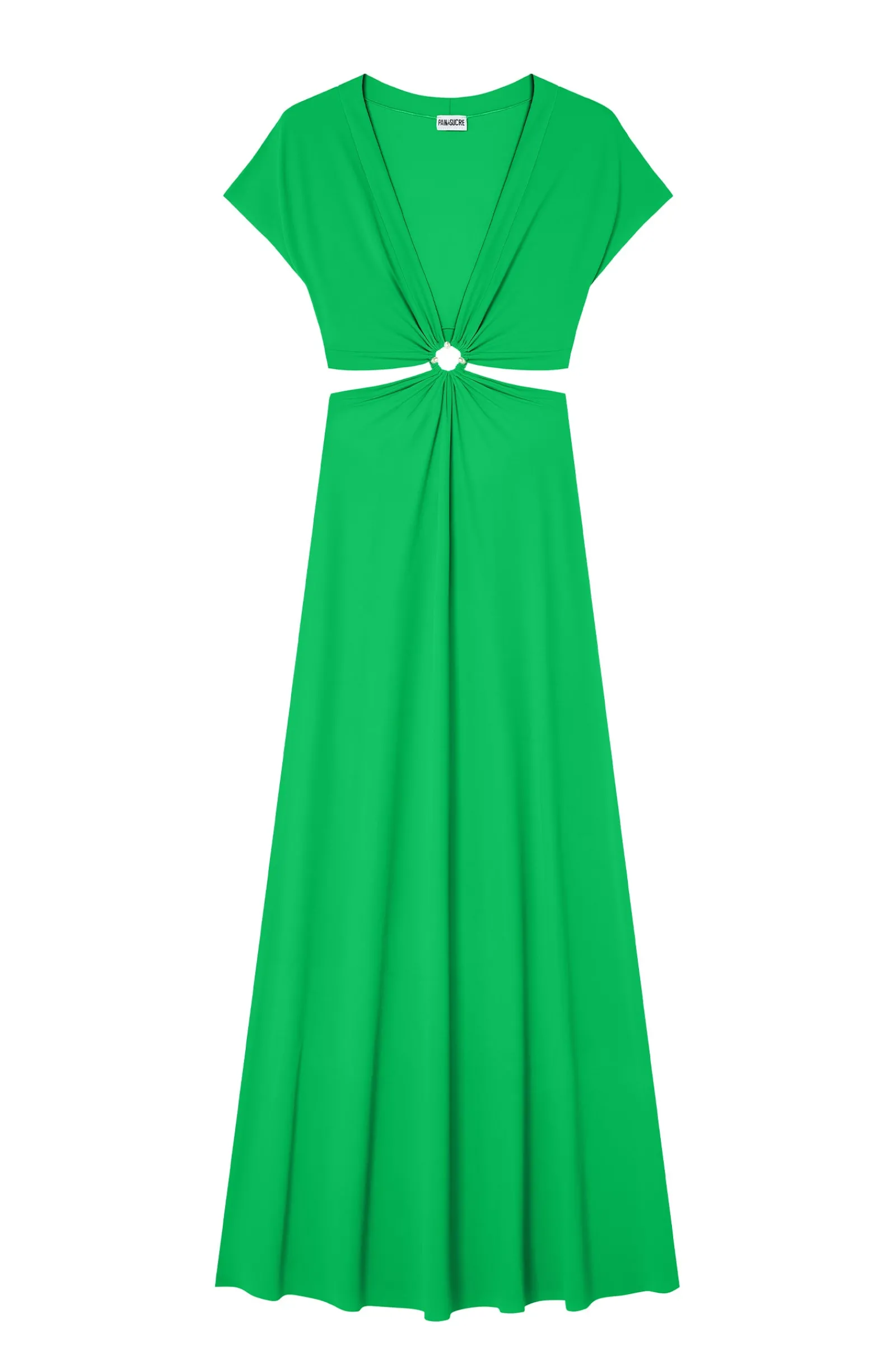 La robe longue échancrée RISLENE offre une allure moderne et audacieuse. Son haut à manches courtes se drape autour d’un ajour, dévoilant trois perles nacrées et se prolonge en une longue jupe fluide. Pomme, un vert lumineux et pétillant.