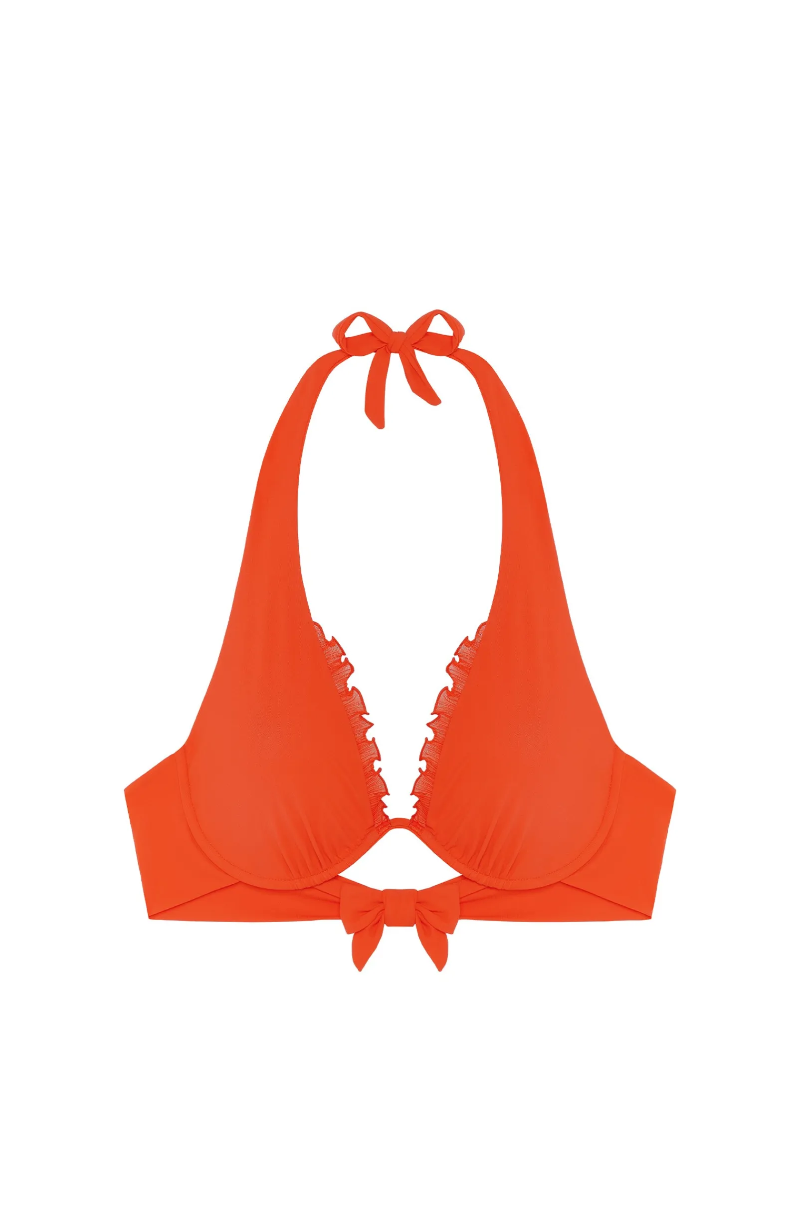 Le haut de maillot de bain SARY à armature unique, création iconique de Pain de Sucre, donne du volume à la poitrine en assurant un confort absolu. Ses bonnets se parent de volants en mousseline plissée pour dynamiser le décolleté. Ses bretelles se nouent derrière la nuque et dans le dos pour s’ajuster à toutes les morphologies. Un orange moderne, intensément vitaminé.