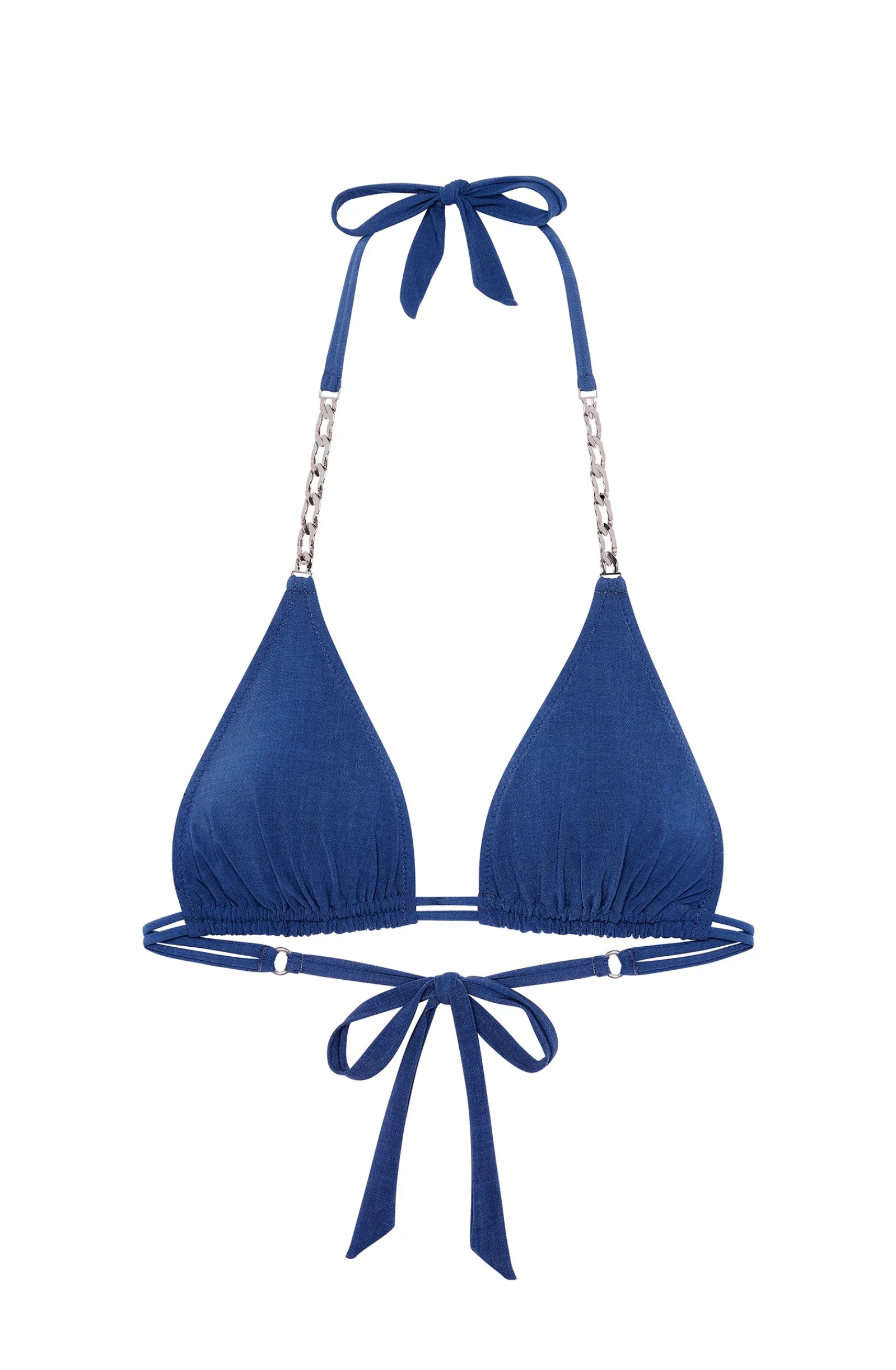 Le haut de maillot triangle SEVIA mêle avec une alchimie parfaite, minimalisme et raffinement. Le double lien coulissant assure un maintien irréprochable et les fines bretelles ornées d’une gourmette argentée subliment le buste. Jean, le bleu denim d’une toile intemporelle.