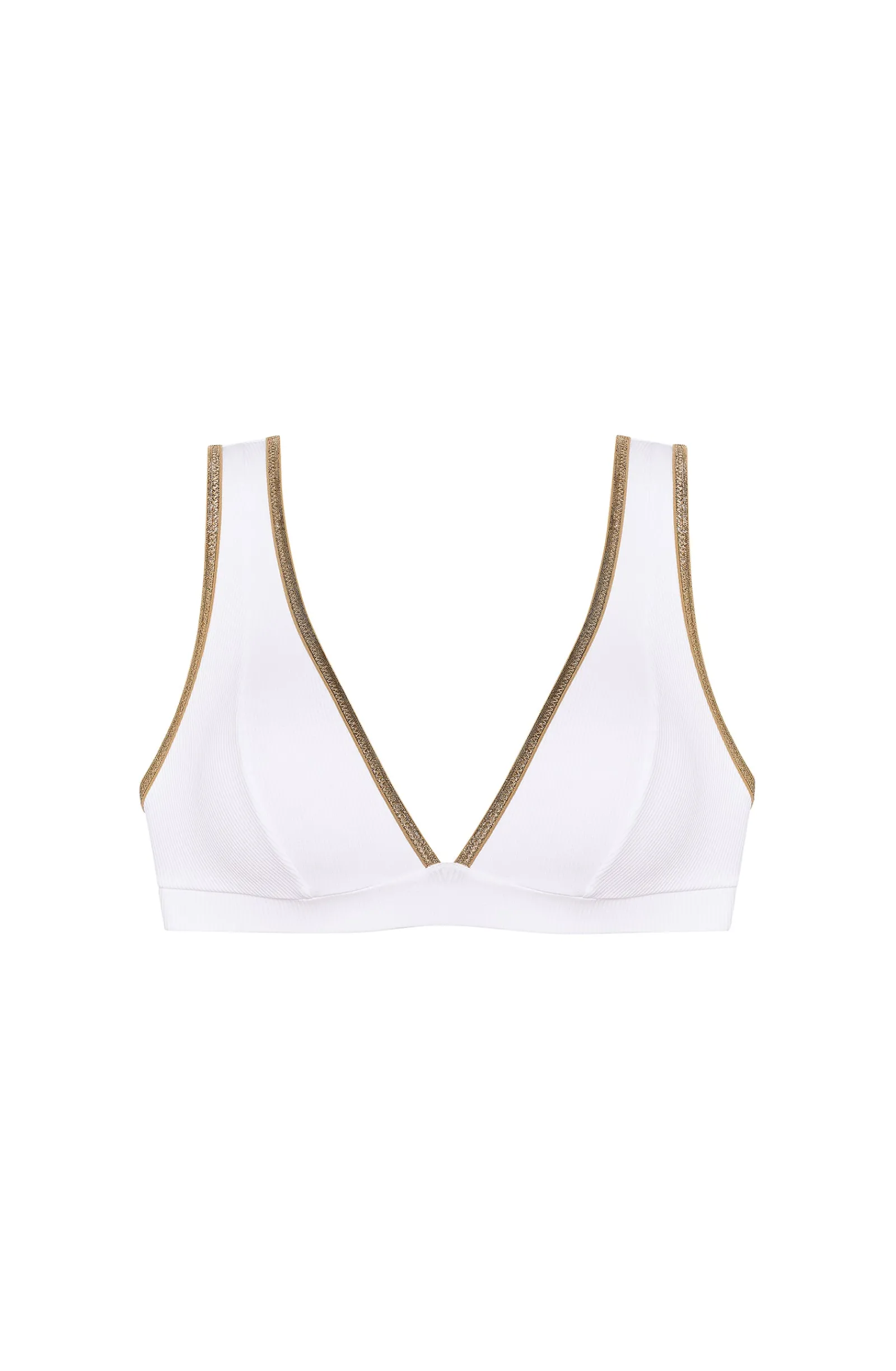 Avec ses larges bretelles et ses bonnets en triangle, la brassière STEVIE assure un confort et un maintien parfaits. Le relief côtelé du tissu en sensitiv lui donne un air vintage et le liseré doré sublime le décolleté. Ce haut de maillot se transforme en un crop top élégant pour une sortie d’été improvisée. Pur et délicat, le blanc illumine le teint.