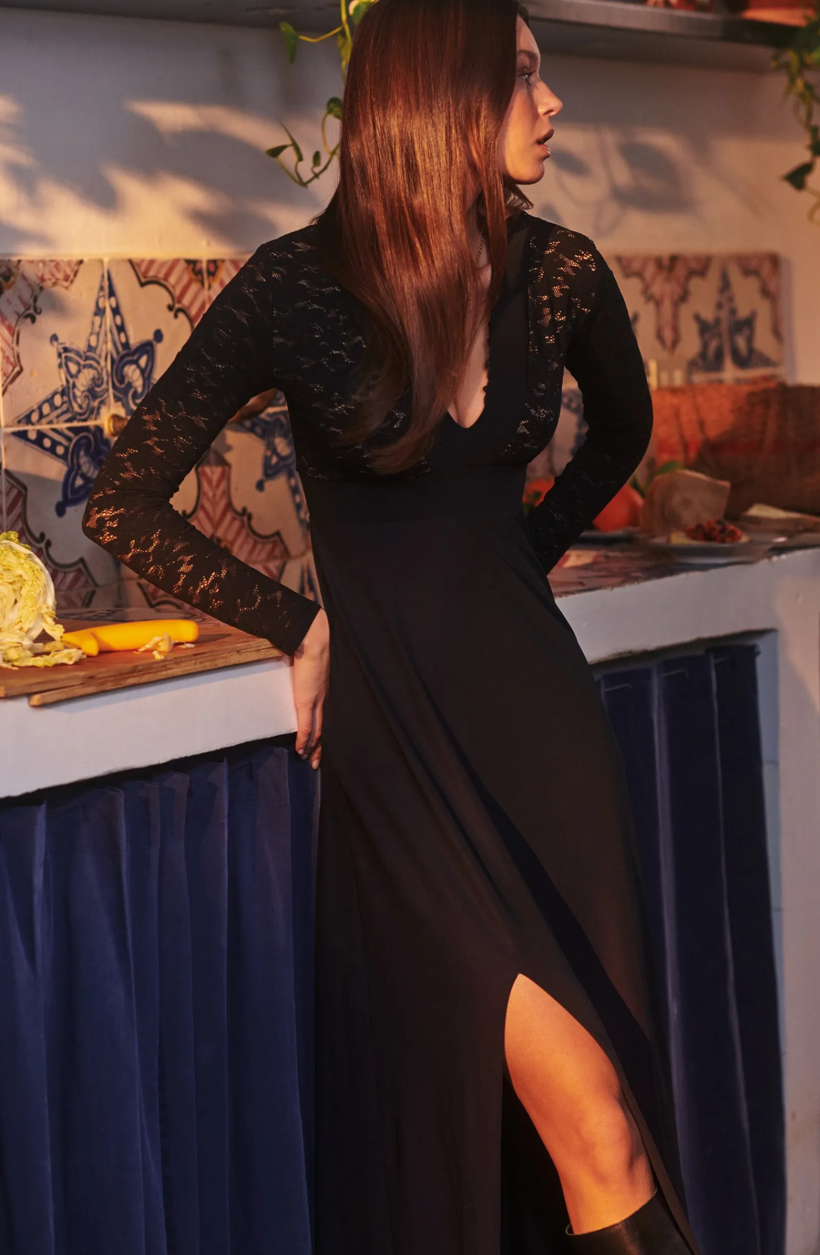 La robe longue VANAO mêle les matières emblématiques de Pain De Sucre. Le haut joue de dentelle, ajourée sur les bras et doublée devant et derrière de tulle chair. Le Bonded structure le décolleté et la jupe fluide fendue sur le côté, offre une silhouette sculpturale. Lichen, une teinte organique, vert kaki.